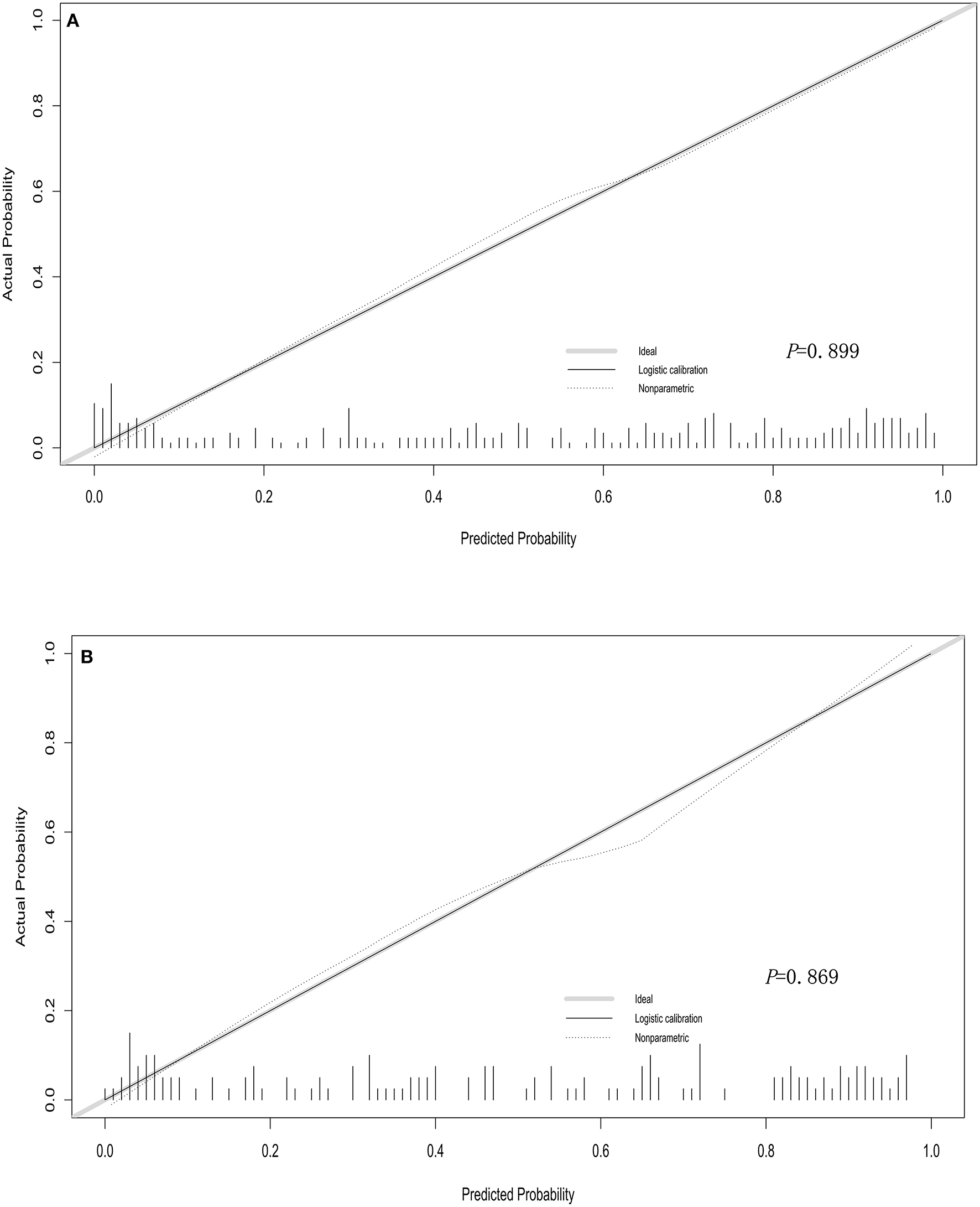 Calibration curves of the nomogram in training cohorts (A) and validation cohorts (B). The calibration curve predicts the risk of RMPP in the queue. The x-axis represented the projected risk of RMPP. The y-axis represented the RMPP of the actual diagnosis. The diagonal dotted line represented the perfect prediction of the ideal model. The solid line represented the performance of the line chart, which is closer to the diagonal dashed line to indicate a better prediction.