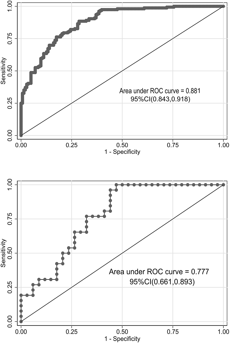 Receiver operating characteristic (ROC) curves of the nomograms in training and validation cohorts. The area under the ROC curve in the training cohorts and the validation cohorts was 0.881 (95% CI: 0.843–0.918) and 0.777 (95% CI: 0.661–0.893), respectively.