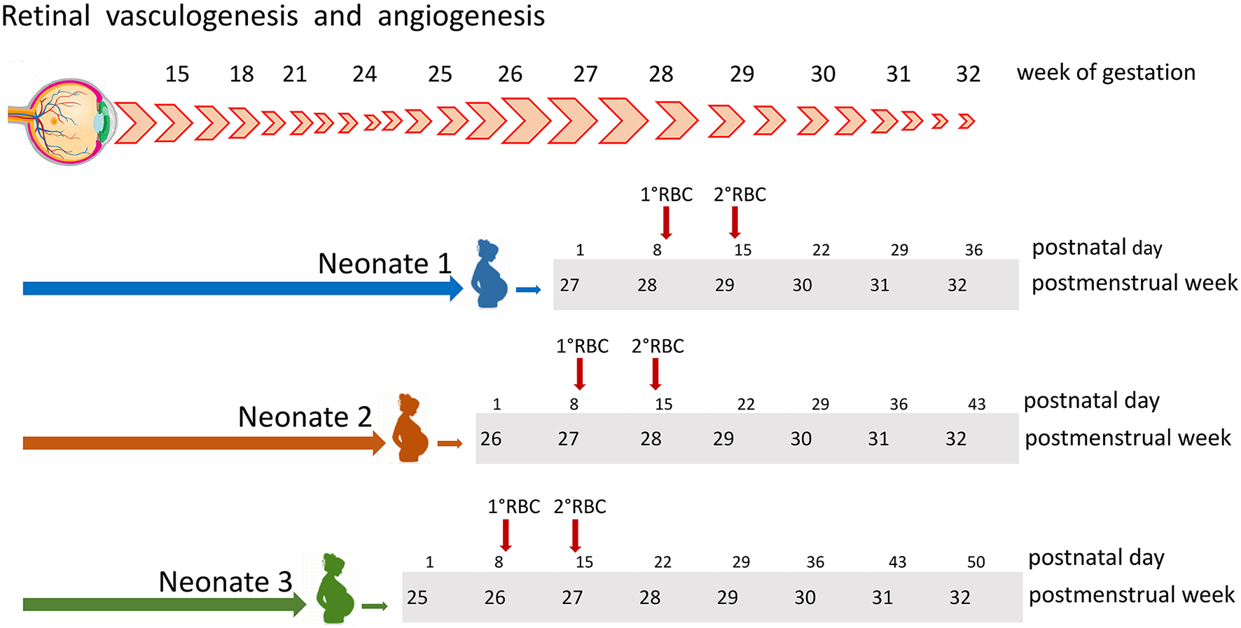 Retinal vessels development occurs through vasculogenesis and angiogenesis in a well-specified period of gestation, starting before week 15 and concluding around week 31. At the bottom are displayed the cases of three neonates, all receiving two RBC units at postnatal days 9 and 14 (red arrows). According to postmenstrual age, at the beginning of week 28, patient 1 had received no transfusion, patient 2 had received one single transfusion, and patient 3 was given two transfusions. RBC, red blood cell.