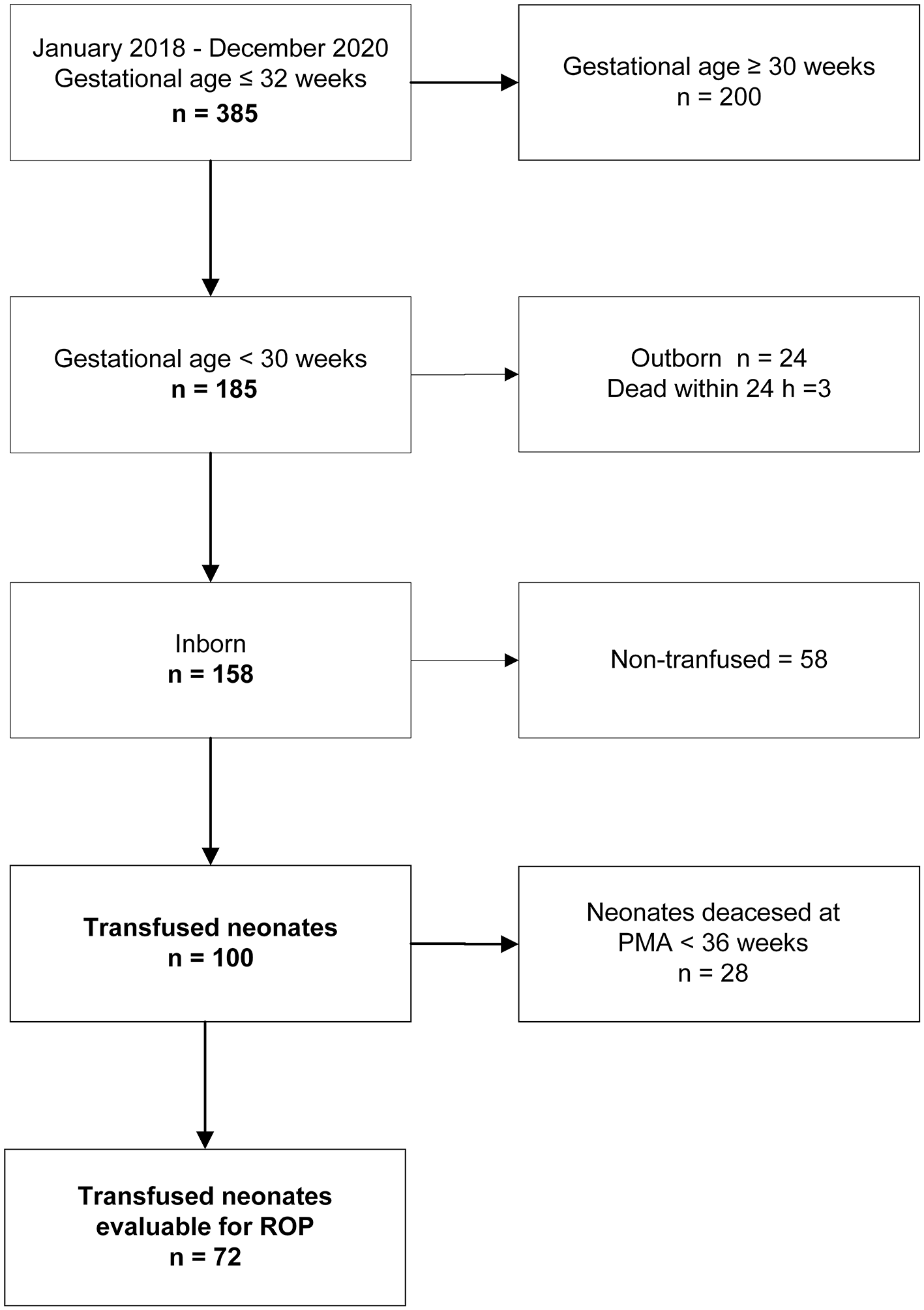 Among 385 preterm neonates initially evaluated, 185 infants had a GA at birth <30 weeks. We excluded 24 outborn neonates and 3 infants who deceased within 24 h. Of the remaining 158 patients, 100 received at least 1 RBC transfusion and were evaluable for the TFS: 72 of them reached the PMA of 36 weeks and were evaluable for ROP (Figure 2).