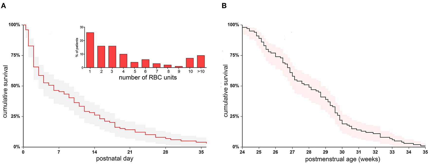 Cumulative transfusion-free survival in the initial cohort of 100 transfused patients. The survival was estimated censoring patients at first RBC transfusion event, expressed according to postnatal day (A) or postmenstrual weeks (B). The distribution of RBC unit needs is also displayed (inset in A). RBC, red blood cell.