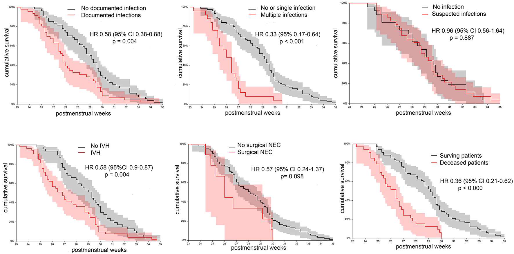 Clinical characteristics of 100 neonates receiving transfusions are shown in Table 1. Median GA at birth was 27.0 weeks (25.0–28.3), and median BW was 795 g (666 – 1,067). The median follow-up was 80 days (32–111), and the median PMA at the last observation was 40.8 weeks (38.0–44.5). All patients received at least one RBC transfusion, and 23 of them were given also PLT units and 8 FFP units. In patients who received different blood products, the transfusion of RBC was antecedent or concomitant to the transfusion of other blood products in 88.4% of cases. Figure 3 shows patient distribution according to the RBC unit consumption and the cumulative TFS of the investigated patients. Censoring patients at postnatal day at transfusion, the median TFS was recorded at day 5.0 (1.9–8.0) (Figure 3A). Alternatively, censoring patients according to the PMA at transfusion, the median TFS was recorded at 28.0 weeks (26.0–29.4) (Figure 3B). We also explored whether the occurrence of various complications or death could be associated with different TFS. We observed that TFS was significantly lower in neonates with documented infections in comparison with other infants (HR 0.58, 95% CI 0.38–0.88, p = 0.004) or in neonates with multiple documented infections in comparison with patients with no or one single infectious episode (HR 0.33, 95% CI 0.17–0.64, p < 0.001). In contrast, suspected infections not followed by pathogen identification did not modify the TFS. Moreover, reduced TFS was significantly associated with the occurrence of IVH (HR 0.58, 95% CI 0.39–0.87, p = 0.004) or death (HR 0.36, 95% CI 0.21–0.62, p < 0.000), while no differences were observed in patients with and without NEC (Figure 4). Overall, these results suggest that concurrent infections, IVH, or death is associated with RBC need in an early phase of life.