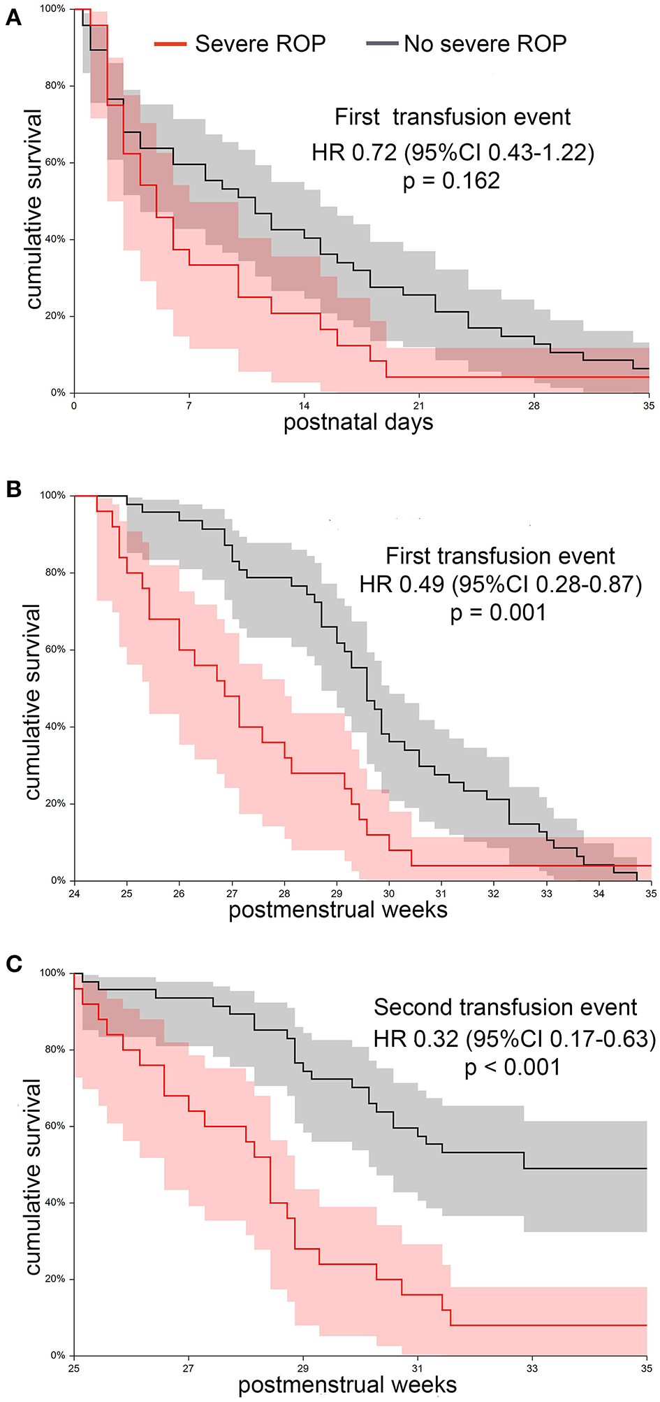 Cumulative transfusion-free survival in a cohort of 72 transfused neonates, grouped according to the occurrence of stage 3 or higher retinopathy of prematurity (ROP). (A) Transfusion-free survival estimated according to postnatal day at first RBC transfusion does not significantly differ between patients with and without severe ROP. (B) Transfusion-free survival estimated according to postmenstrual age at first transfusion is significantly lower in neonates developing severe ROP. (C) The difference between groups is even greater if survival to the second RBC transfusion event is considered. RBC, red blood cell.