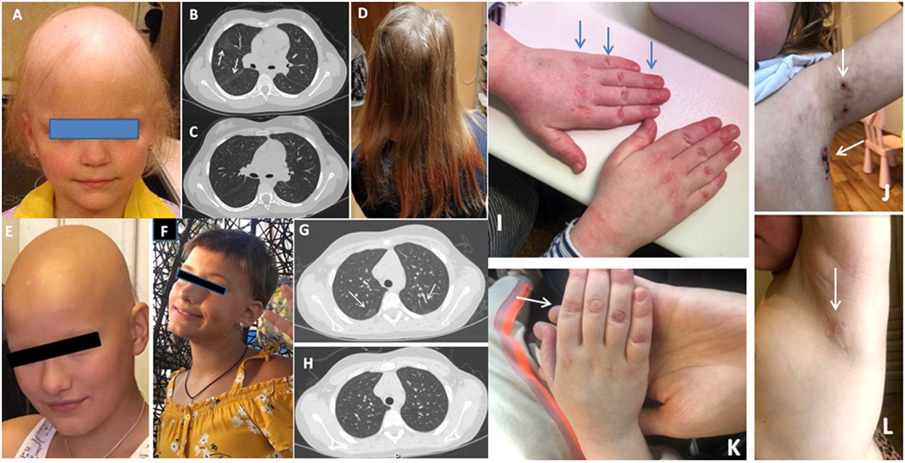 (A) Alopecia in JIA2 patient (before tofacitinib); (B) Chest CT from patient JIA2 (interstitial thickness and ground-glass opacities - arrows); (C) Chest CT from patient JIA2 following 3 years of tofacitinib therapy (resolution of interstitial thickness and ground glass opacities); (D) Hair growth in JIA2 patient (3years on tofacitinib); (E) Alopecia in patient JIA10 before tofacitinib treatment and after 6 months of treatment (F); (G) Ground-glass opacities in patient JDM1 before tofacitinib (arrows) and 2 years on tofacitinib (H); (I) The hands with Gottron papules before tofacitinib treatment in JDM2 patient and the left axillary area (arrows) with necrotizing changes (J); (K) the right hand 16 weeks after tofacitinib treatment and the left axillary area (L) after 6 months of tofacitinib treatment of the same patient.