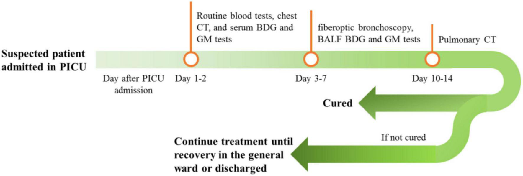 Demographic data and clinical characteristics such as clinical manifestation and acute physiology and chronic health evaluation (APACHE) score were obtained from medical records. Routine blood biochemical tests, chest CT, and serum 1,3-beta-D-glucan (BDG) and GM tests were performed on days 1 and 2 of PICU admission. For suspected patients and those with unfavorable outcomes after routine anti-infection treatment, fiberoptic bronchoscopy and alveolar lavage were performed from days 3 to 7; BALF was tested using BDG and GM tests. Chest CT was performed for all patients after 10–14 days of antifungal infection treatment (see Figure 1). All test results and clinical data were recorded and retrospectively analyzed. Patients were divided into fungal (F) and non-fungal (NF) groups, depending on the presence or absence of fungal infection. The diagnostic criteria for fungal infection were (1) the child had a history of cough, wheezing, and fever, (2) pulmonary rales and sounds, (3) no obvious improvement with antibiotic treatment, (4) pulmonary CT showed signs of fungal infection, (5) fungi were cultivated in blood or BALF, (6) the G and GM tests were positive in blood or BALF, and (7) the condition was significantly improved with antifungal treatment (21–23).