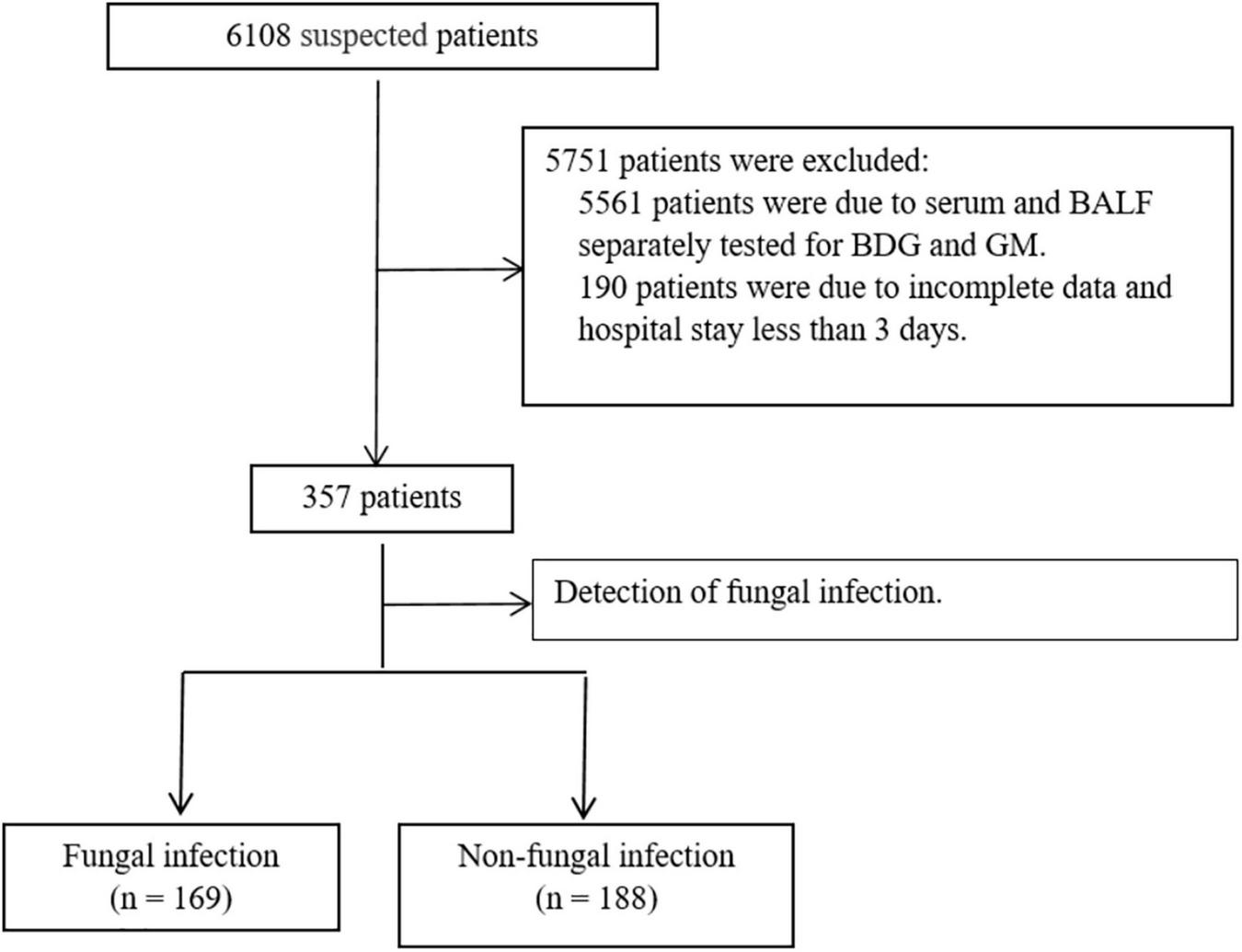 Serum GM > 0.5, BALF GM > 0.7, serum BDG > 100 pg/mL, and BALF BDG > 200 pg/mL were defined as positive values for fungal infection (9, 20).