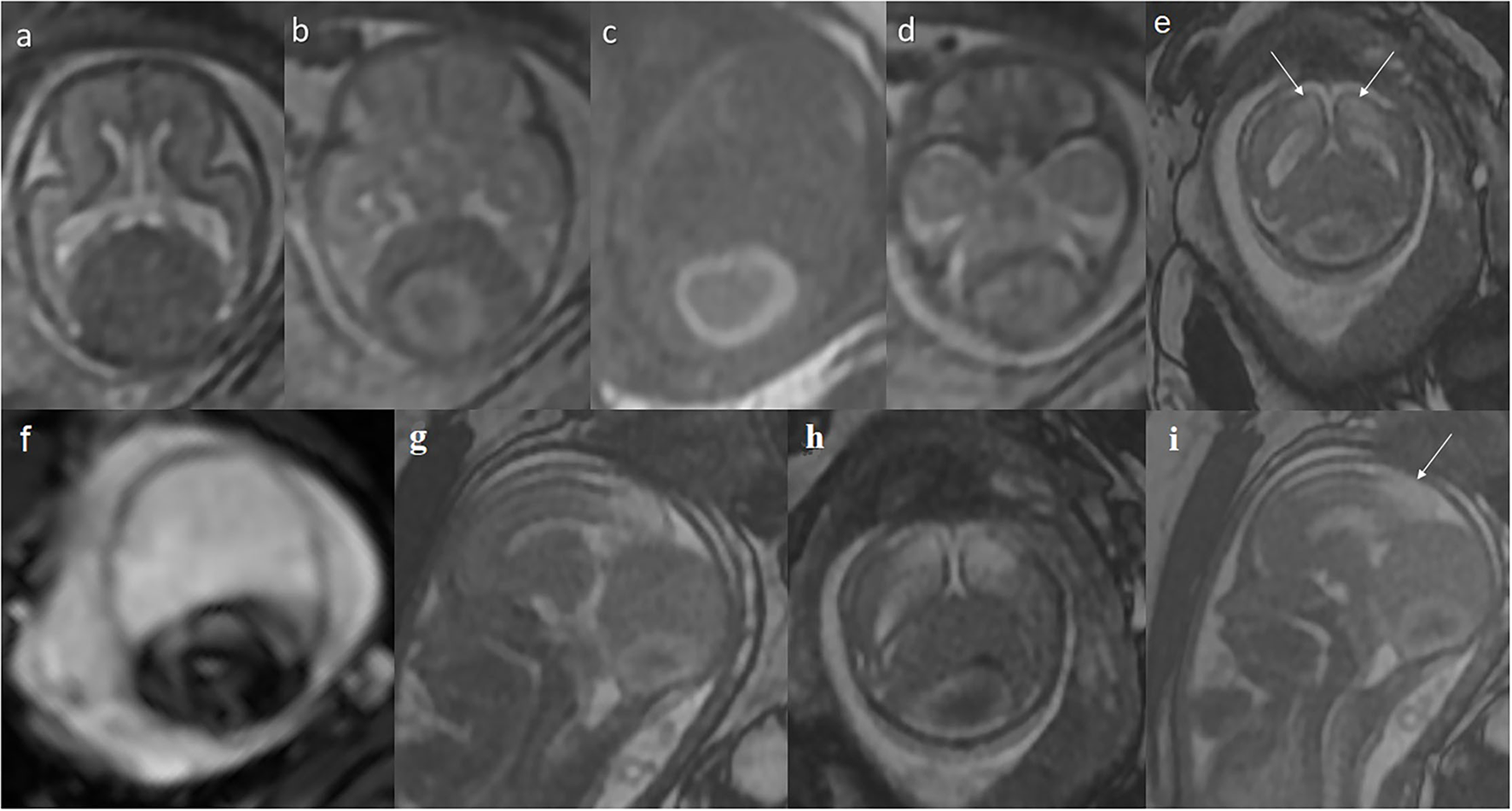 Prenatal MRI at the 23rd gestational week: (a–f) axial, (g,i) sagittal, and (h) coronal plane. Giant widening of the venous sinuses around the sinus confluence. The lesion lifts (h) and displaces the cerebral hemispheres apart (a,b) and compresses and displaces the posterior cranial fossa structures forward (d,g), with the brain stem pressed against the clivus (g). A thrombus (c) containing hemosiderin (g) inside. (e,i) Abnormal T2-hyperintensity of the posterior-medial parts of the cerebral hemispheres is appreciated (arrows) in FIESTA, indicating ischemia/edema caused by the huge mass of sinus ectasia.