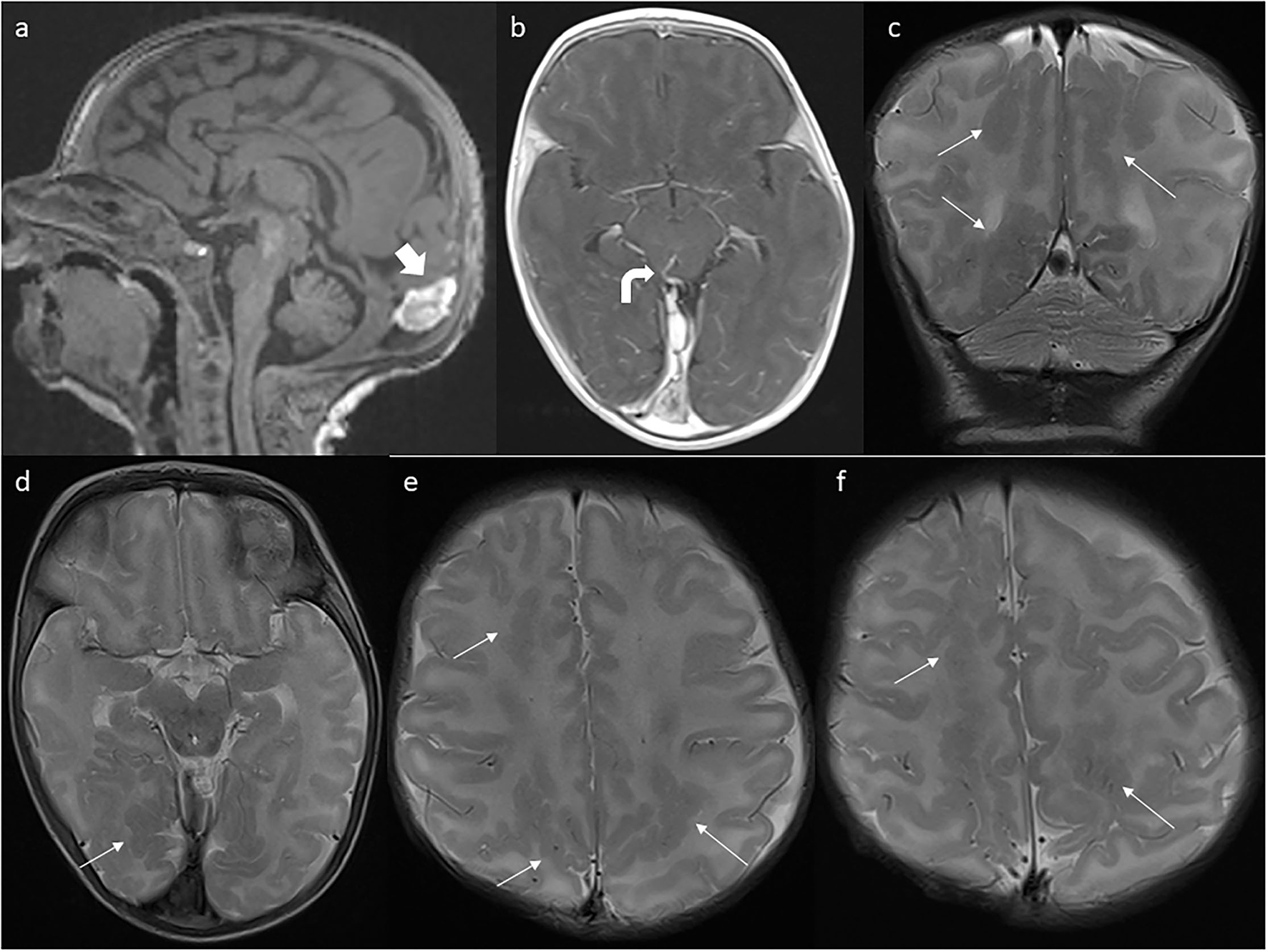 First postnatal MRI scan at the age of 4 weeks. (a) Partial regression of dural ectasia (thick arrow). (b) One of the abnormal vessels (curved arrow). (c) Bilateral parasagittal polymicrogyria (thin arrows) in coronal and (d–f) axial planes.