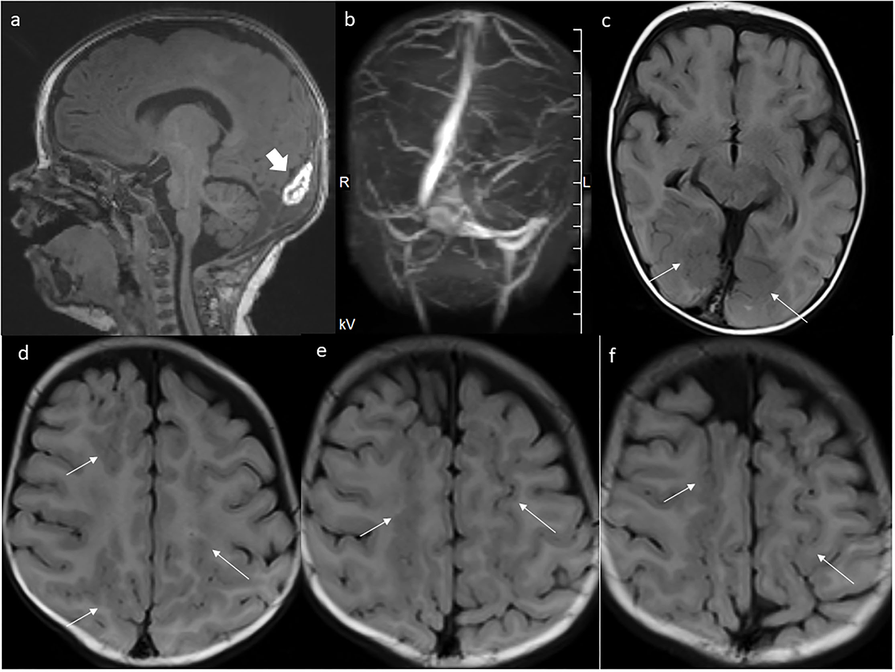 MRI at the age of 5 months. (a) Further thinning of the mass. (b) Patent dural venous sinuses in MR venography. (c–f) The extent of polymicrogyria in the parasagittal parts of the occipital, parietal, and frontal lobes is even better seen now in axial FLAIR images.