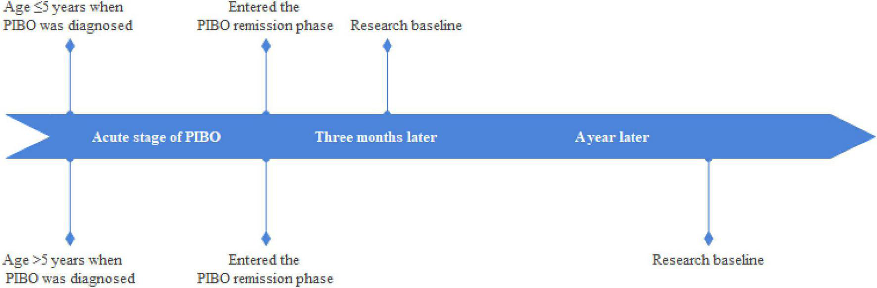 The setting of the research baseline was as follows: (1) patients with PIBO aged ≤ 5 years to pass through the acute phase of the disease and complete the acute phase treatment regimen, and continuous ICSs for 3 months. (2) patients with PIBO aged > 5 years to pass through the acute phase of the disease and complete the acute phase of the treatment regimen, and continuous ICSs for 1 year (Figure 1).