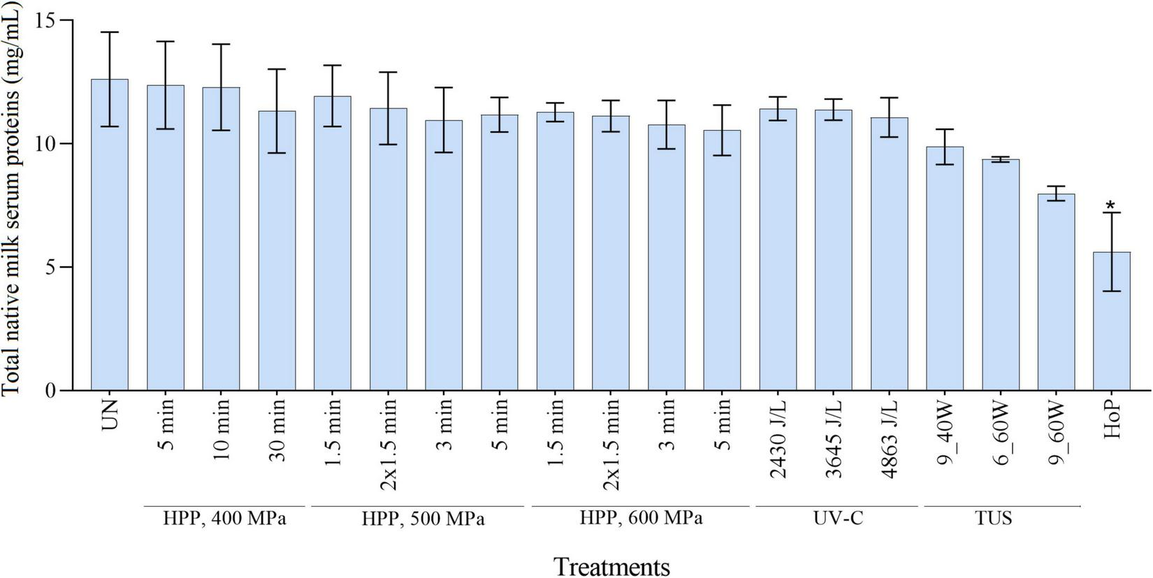 Native milk serum protein concentration as determined with a BCA assay. The results are presented as mean ± standard deviation of two independent experiments and all analyses were performed in technical duplicate. UN represents the untreated values. *Indicates significant differences to untreated samples (p < 0.05).