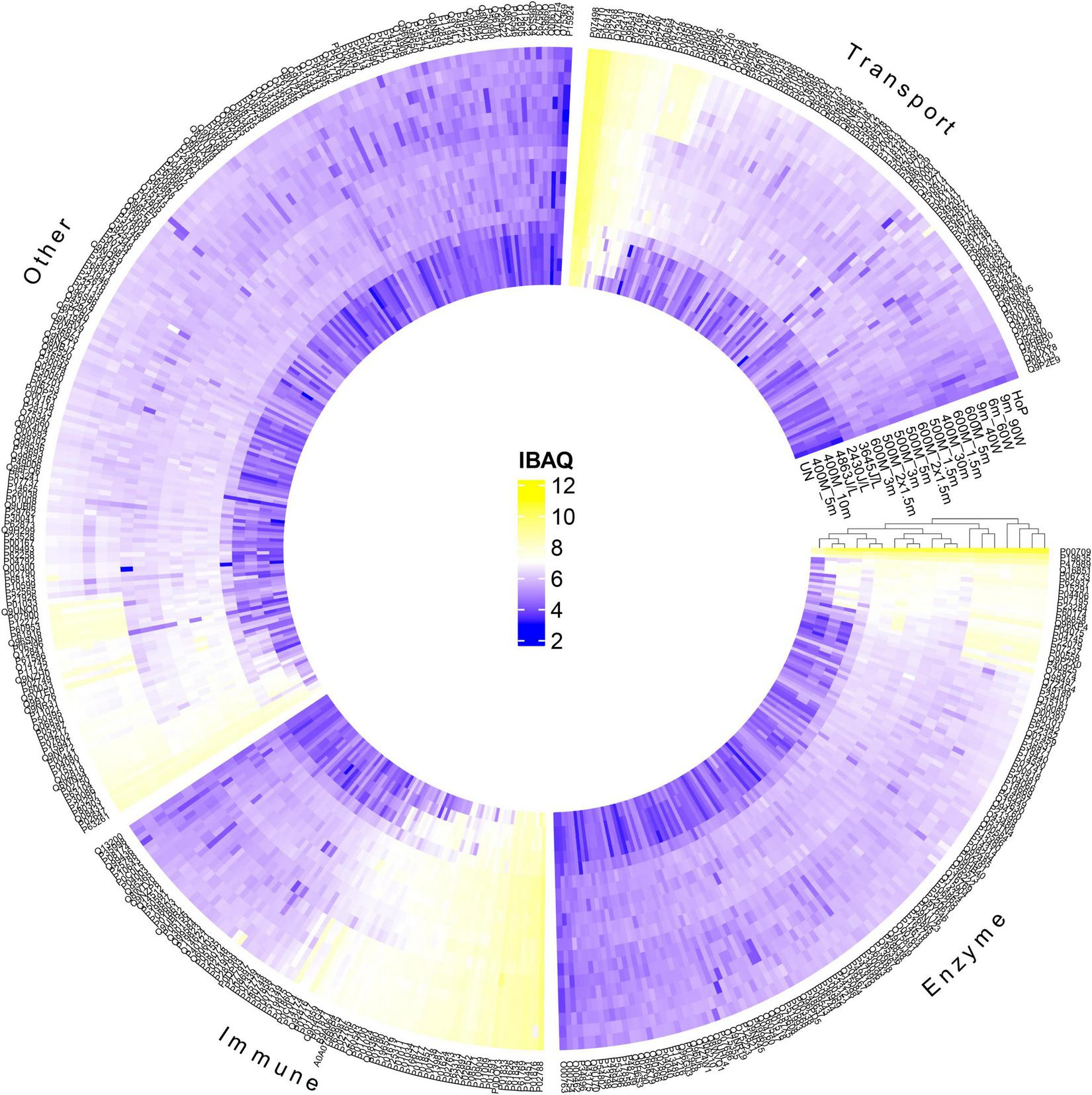 Hierarchical cluster analysis and heatmap showing the changes in the protein profile after HPP, UV-C, TUS, and HoP, based on iBAQ values (log10 scale from 2 to 12 according to color bar). Proteins are labeled by their UniProt ID. Functional categories (enzyme, immune, transport, and other) were based on GO annotation of biological function. Two independent experiments (biological replicates) were performed while all analyses were performed in technical duplicate for each sample. UN represents the untreated values. HPP; 400 MPa for 5, 10, and 30 min, 500 MPa for 1.5, 2 × 1.5, 3, and 5 min, 600 MPa for 1.5, 2 × 1.5, 3, and 5 min, UV-C; 2430J/L, 3645J/L, and 4863L/L,TUS; 9_40W, 6_60W, and 9_60W.