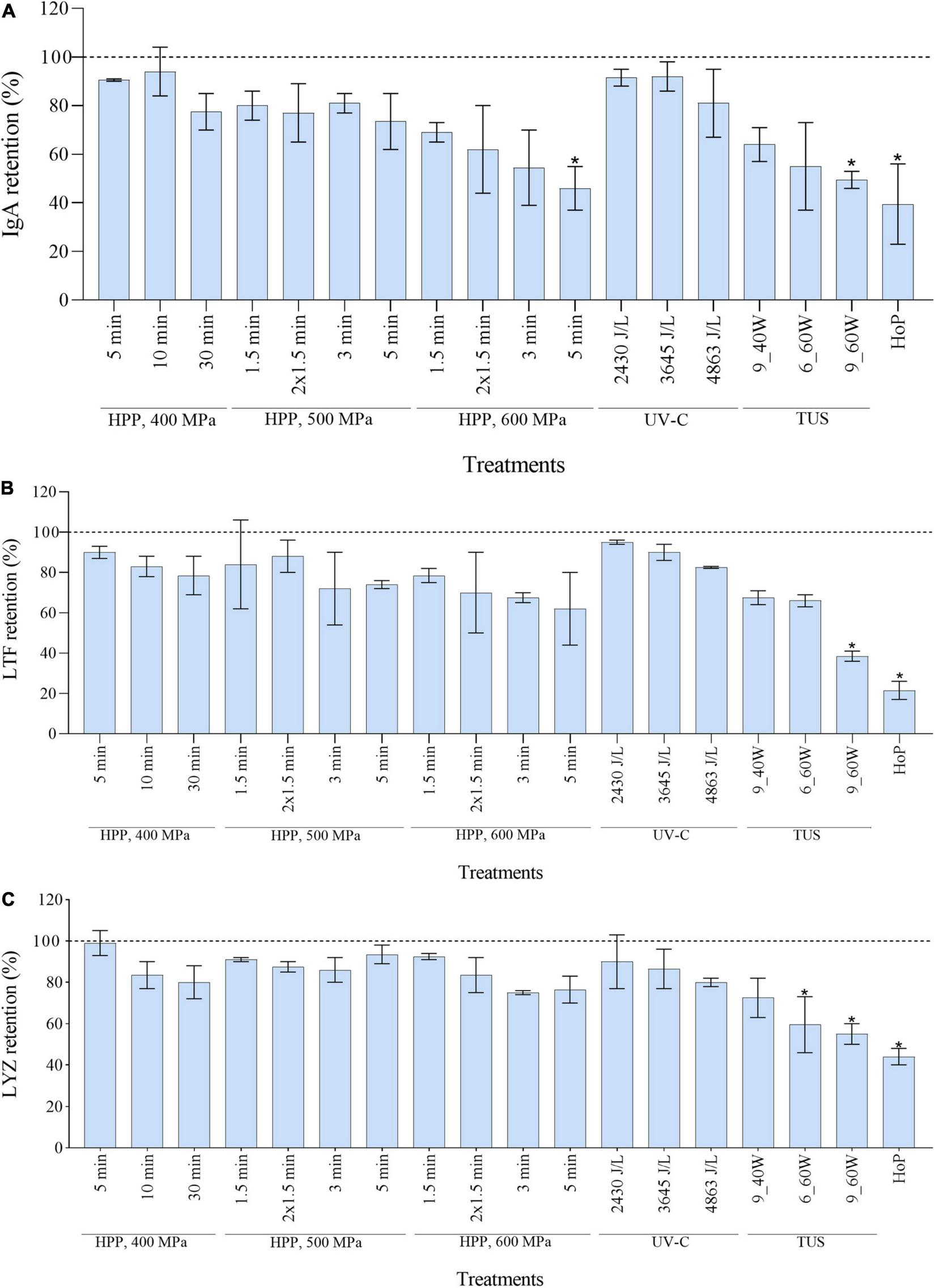 Effect of HPP, UV-C, TUS and HoP on the IgA (A), LTF (B), and LYZ (C) content. The retention values were calculated based on the iBAQ intensities obtained by LC-MS/MS analysis. Untreated values were set at 100% (dotted line). The results are presented as mean ± standard deviation of two independent experiments and all analyses were performed in technical duplicate.*Indicates significant differences to untreated samples (p < 0.05).
