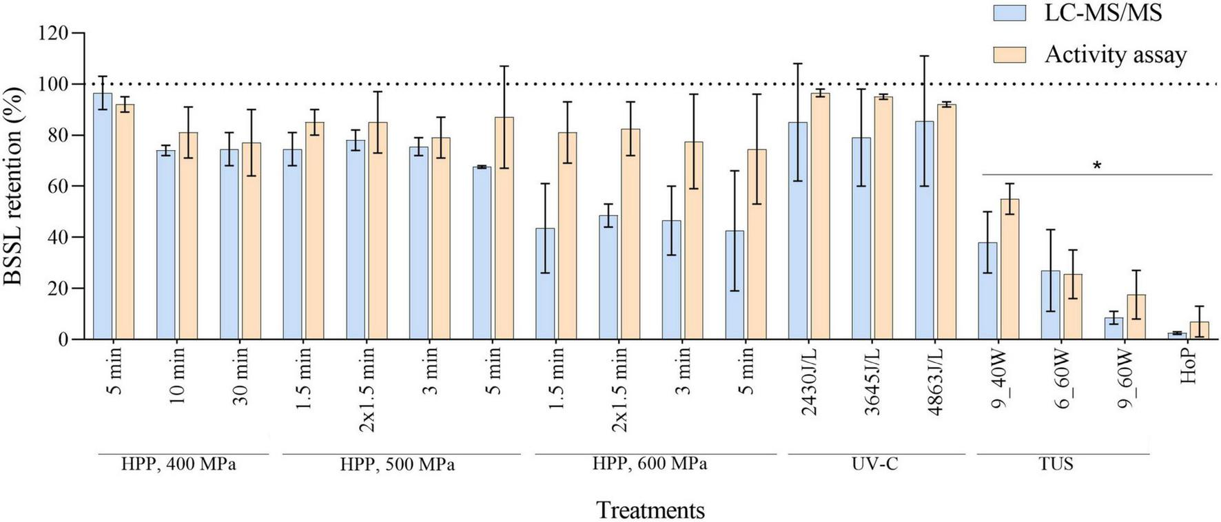 BSSL retention after HPP, UV-C, TUS, and HoP, based on iBAQ intensities and a lipase activity assay. Untreated values were set at 100% (dotted line). The results are presented as mean ± standard deviation of two independent experiments and all analyses were performed in technical duplicate.*Indicates significant differences to untreated samples (p < 0.05).