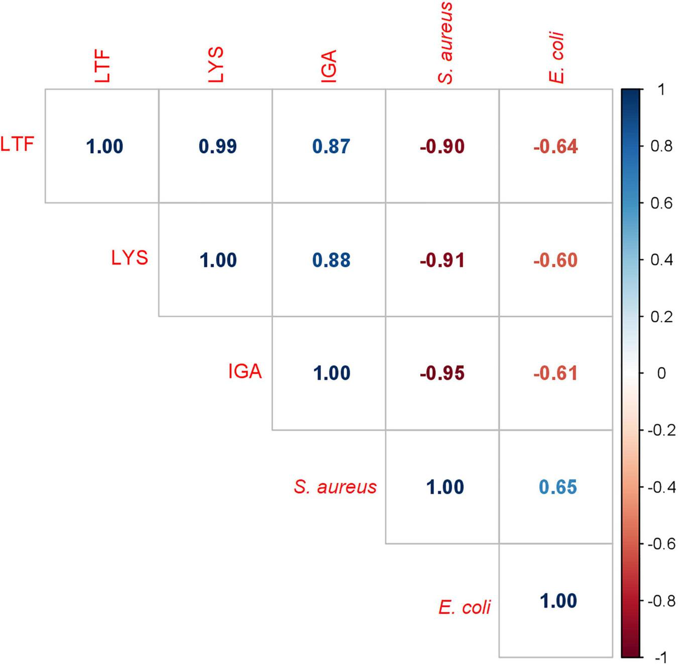 Correlation matrix of S. aureus and E. coli growth rates and IgA, LTF and LYZ iBAQ values. Each box contains an r value (Pearson correlation coefficient).