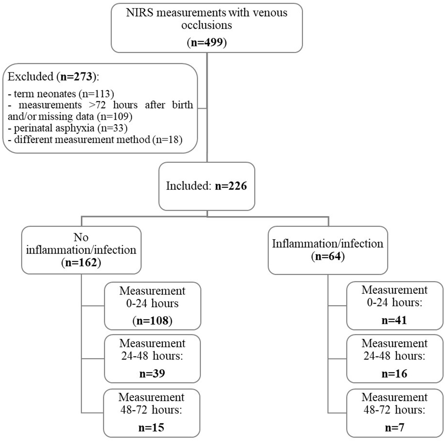 During the study period, NIRS measurements with venous occlusions were performed in 499 neonates. A total of 273 patients were excluded due to several reasons: term neonates (n = 113), measurements later than 72 h after birth and/or missing data (n = 109), perinatal asphyxia (n = 33), and different measurement method (n = 18). Hence, NIRS measurements from 226 preterm neonates with a median gestational age of 33.9 (32.4–35.0) weeks were analyzed.