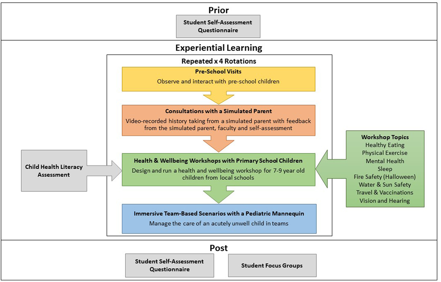 Despite the importance of effective communication skills in pediatrics, clinical placements may inadequately prepare undergraduate students to communicate with children. The integration of non-clinical interactions with healthy children within a pediatric curriculum has the potential to enhance learning. We designed and implemented a novel course involving experiential learning, including video-recorded consultations with simulated parents (SPs), team-based scenarios with a pediatric mannequin, interactions with healthy children through a pre-school visit and medical student led health workshops for primary school children. Medical students at the RCSI University of Medicine and Health Sciences took part in the course. We used a mixed methods approach to assess the impact of the course. We investigated medical students' perspectives through a pre- and post-intervention questionnaire and post-intervention focus group discussions (FGDs). We assessed participating children's health literacy at the start of the course. 144/279 (51.6%) of the fourth year medical student cohort on their pediatric rotation, consented to participate in the study. All 144 (100%) of consenting students completed the pre-intervention questionnaire. 59/144 (40.1%) of consenting students completed the post-intervention questionnaire. Results showed a statistically significant improvement in ratings (p < 0.05) for items related to managing a confrontational situation involving family members, completing a psychosocial assessment with an adolescent and effectiveness using evidence-based medicine (EBM) when motivating patients. There was a statistically significant decrease in how students rated their comfort at using EBM when motivating patients. Four themes relating to how students experienced the intervention were identified from eight FGDs (n = 35 students): Shaping Student Learning; Supporting Student Learning; Developing New Skills and Feeling More Prepared. 39/49 (79.6%) children completed a health literacy assessment. All questions had a high percentage of positive responses. Question 7, understanding your doctor, had the highest proportion of negative responses (27%). Ours is one of the first studies to design an educational intervention to enhance pediatrics teaching by combining interactions with healthy children outside of a clinical setting with more traditional simulation-based approaches. We conclude that this type of intervention supports students' learning of pediatric communication skills and enhances students' perceived preparation for clinical placement.