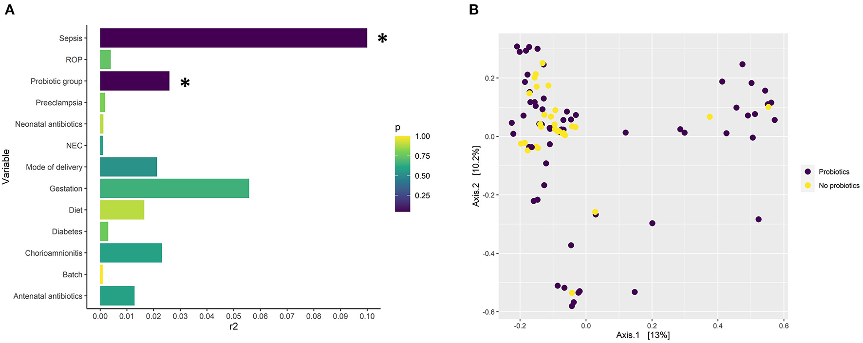 (A) Significance and the amount of variance in gut microbiome composition explained by several microbiome covariates modeled with EnvFit on an NMDS ordination based on Bray-Curtis distances from the 16S rRNA short amplicon sequencing data. The x axis describes the explained variance (r2) and the color the p-value (adjusted for false discovery rate with the Benjamani-Hochberg method). Annotation for necrotising enterocolitis, NEC; retinopathy of prematurity, ROP. P < 0.05 = *. (B) Principle coordinate analysis (PCoA) plot based on ASV level taxonomy obtained through 16S rRNA short amplicons sequencing describing the dissimilarity of probiotic-supplemented (n = 63) and non-supplemented groups (n = 31) based on taxonomy.