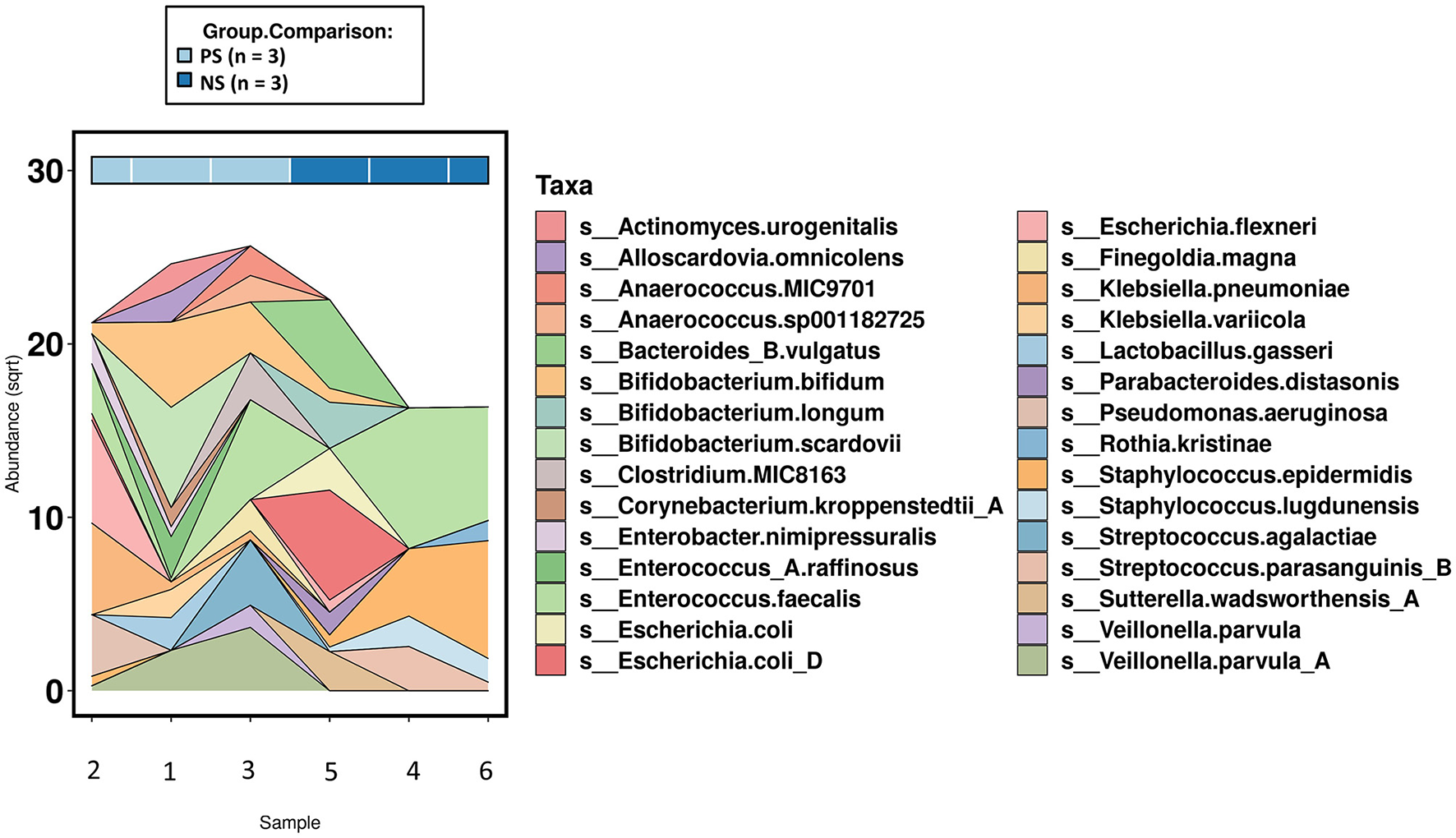 Area chart of species level abundances (top 30-most abundant)across the subset of samples that underwent shotgun metagenomics (n =6). PS, probiotic-supplemented; NS, not supplemented; sqrt, square root transformation.