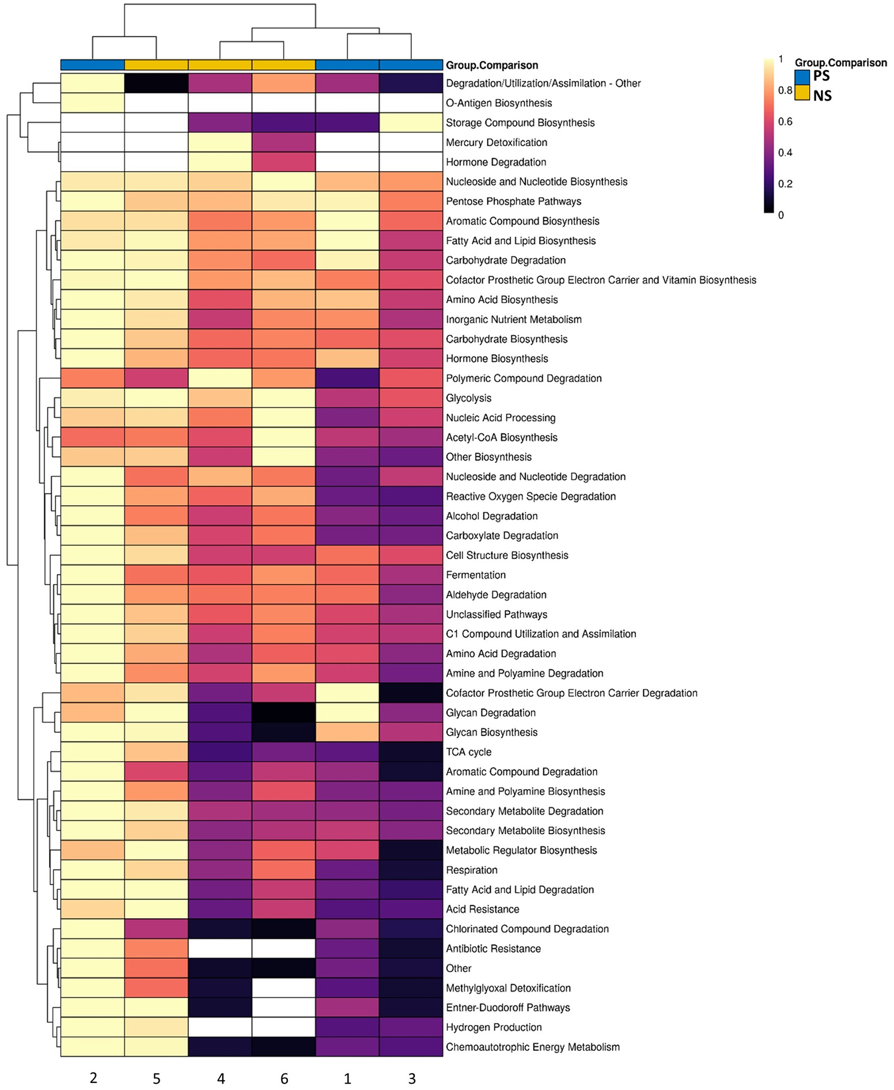 Scaled heatmap of MetaCyc groups for the subset of samples that underwent shotgun metagenomics across probiotic-supplemented (n = 3) and non-supplemented (n = 3). Color scale shows not-detected (white), and abundances ranging from low (black) to high (yellow).