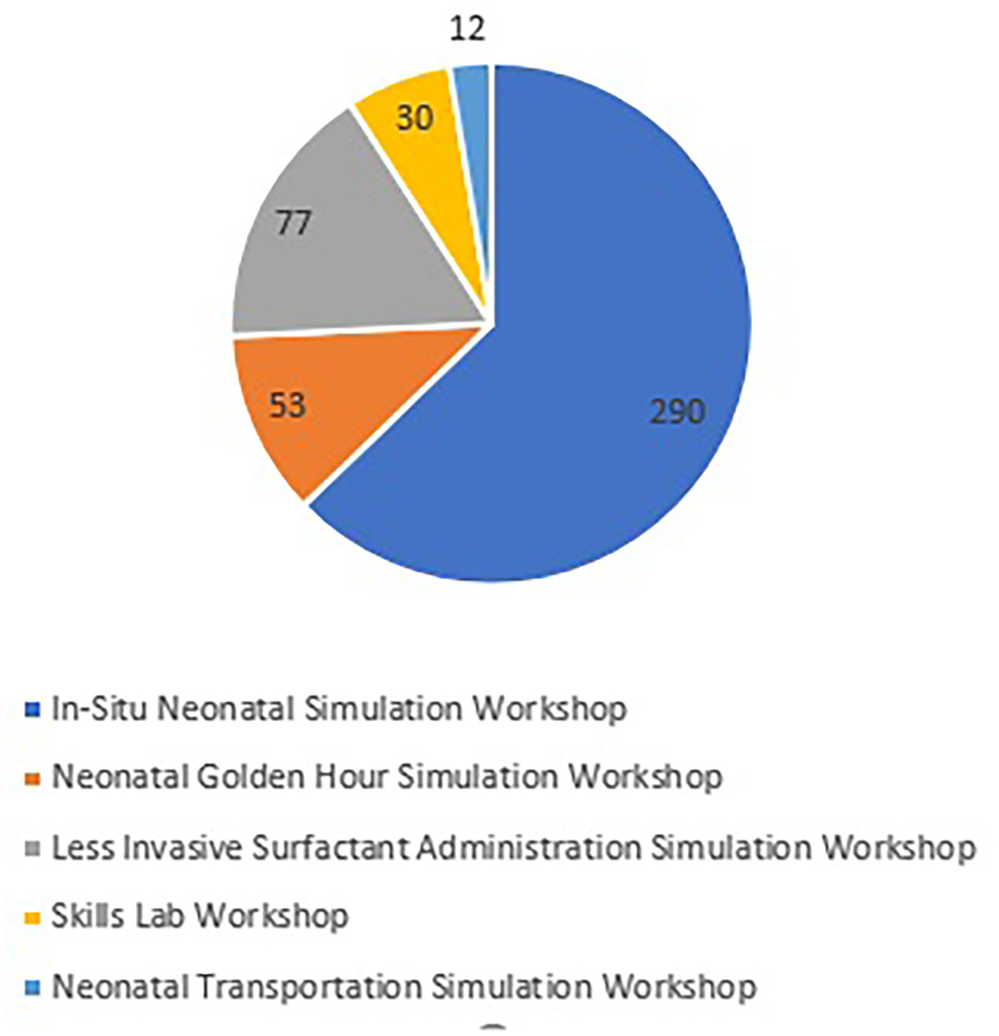 After setting the scope, performing the educational needs assessment, and designing the learning objectives, the team has developed 6 types of curricula; 1 full-day course and 5 half-day workshops. Thirty Five free of charge simulation courses/workshops were conducted in Qatar and abroad based upon the educational need's assessment. The full-day course is the neonatal emergencies simulation course which was conducted 8 times; 5 in Qatar and 3 abroad in Egypt, UAE, and Singapore. In addition to that, 27 half-day workshops were conducted in Qatar: 13 in situ neonatal simulation workshops, 7 less invasive surfactant administration simulation workshops, 2 neonatal golden hour simulation workshops, 1 neonatal transportation simulation workshop as well as 4 skills lab workshops. The program non-mandatory sessions attracted 799 local, regional and international attendees. We have a total of 46 current facilitators for all the courses/workshops in addition to 4 who already left the program. The team has produced 7 educational videos for different courses and workshops to aid in the educational process. The full-day neonatal emergencies simulation course attracted a total of 337 local, regional and international participants. Figure 1 shows the number of attendees of the 5 half-day workshops. Figure 2 indicates the percentages of professions of the participants.