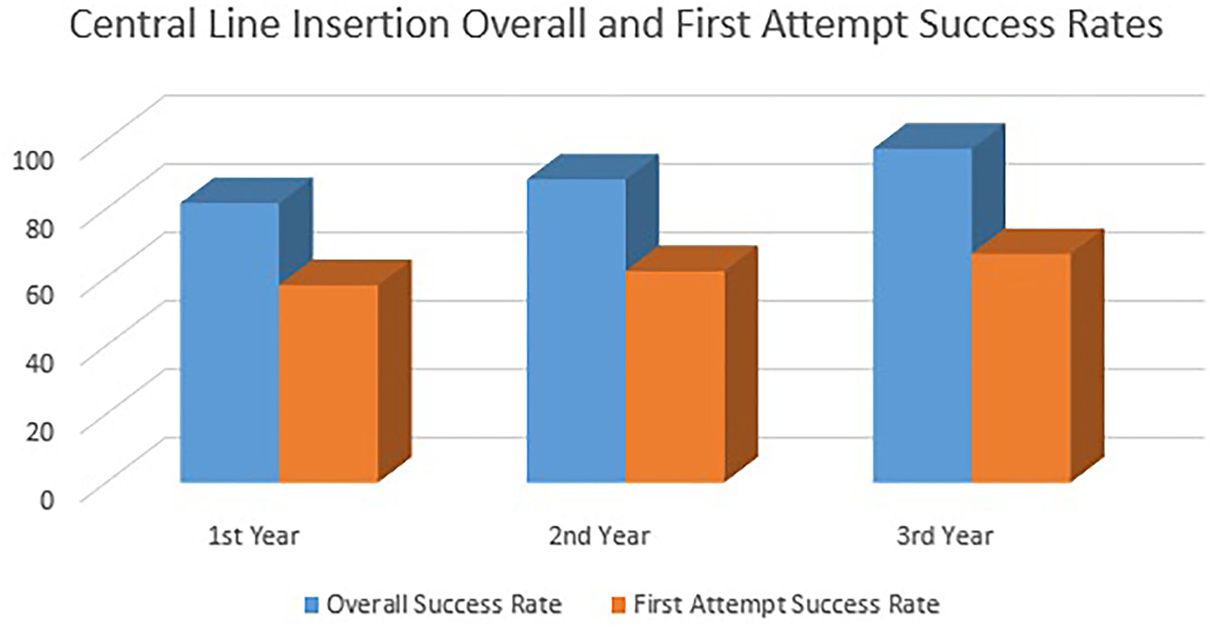We traced the overall and first-attempt success rate of the Peripherally Inserted Central Catheters (PICCs) in the first 3 years after conducting the central line simulation workshops. Figure 3 shows the gradual sustained improvement in both overall and first-attempt success rates across the 3 years.