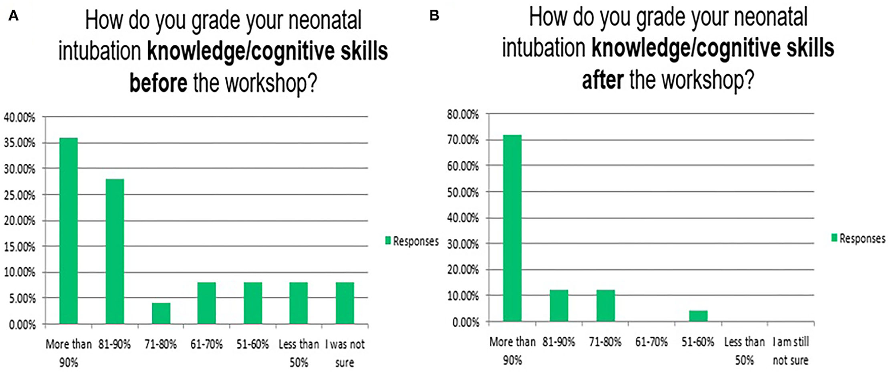 Reflects the attendees' perception/opinion of their knowledge/cognitive skills of the neonatal endotracheal intubation before (A) and after (B) the simulation event.