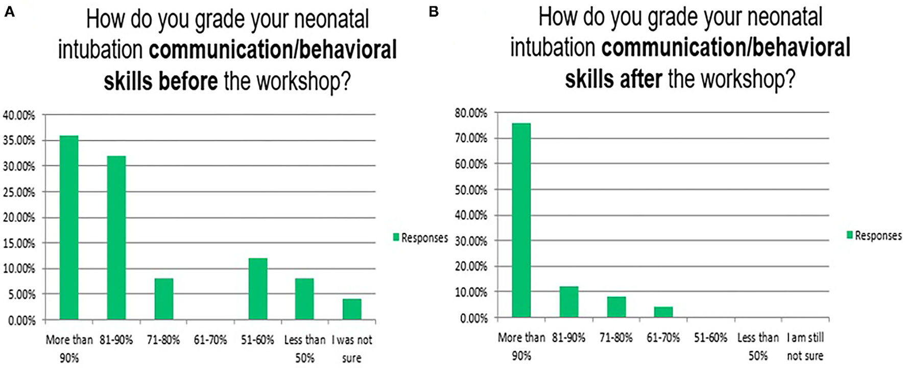 Reflects the attendees' perception/opinion of their communication/behavioural skills of the neonatal endotracheal intubation before (A) and after (B) the simulation event.