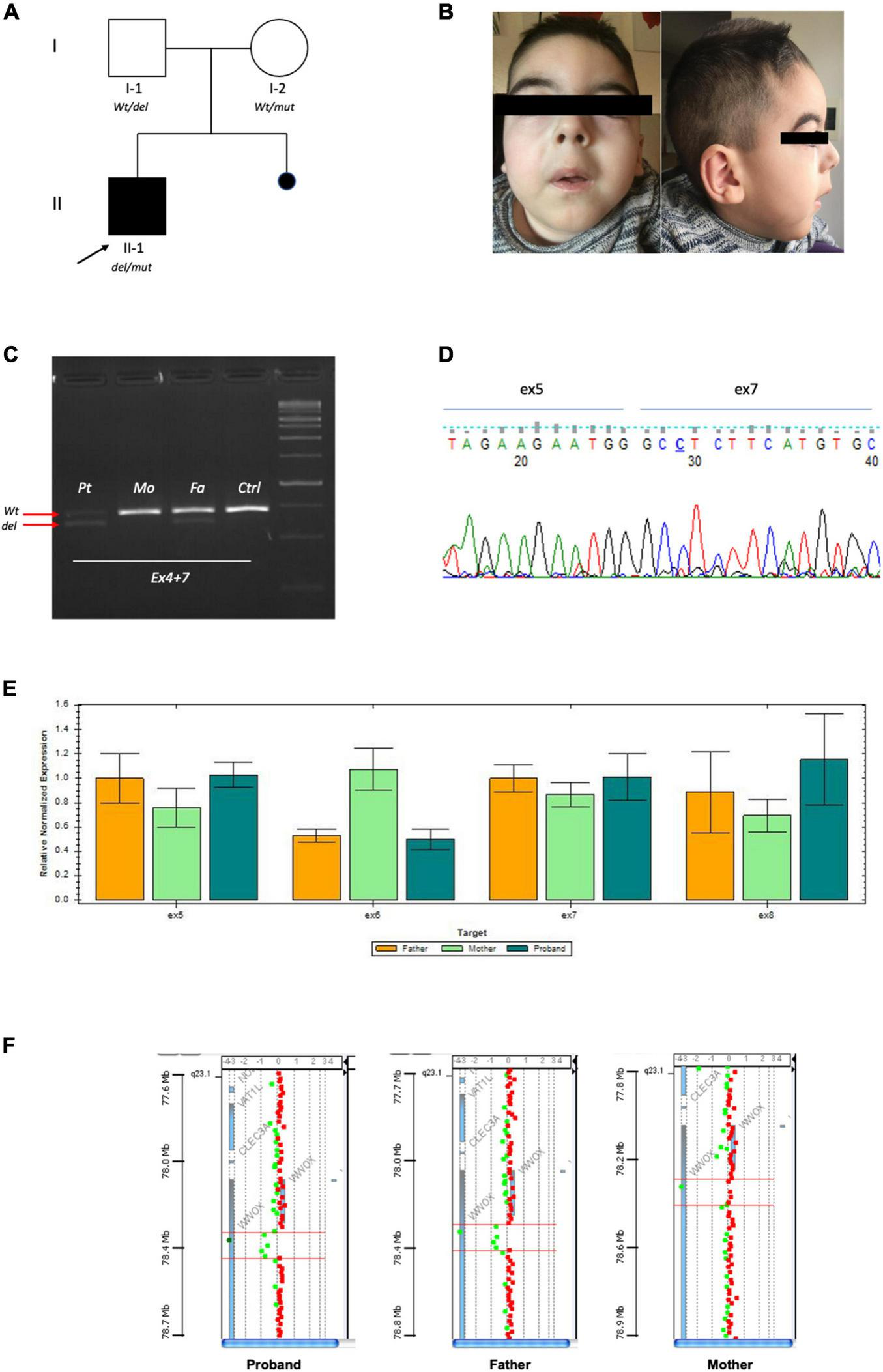 (A) Pedigree of family: Full square mutated affected case. Empty circle and square unaffected parents. (B) Portraits of patient II-1 at 4 years. (C) RT-PCR by fibroblasts showing that the proband and his father had the same product pattern. Arrows indicate the Wt product and deleted one. (D) Sanger of the deleted fragment showing fusion of exon 5 and 7. (E) Confirmative qPCR on DNA validating exon 6 deletions with loss of 50% product in the proband and carrier father. (F) High resolution array-CGH 180K highlighting genomic deletion of the proband and father.