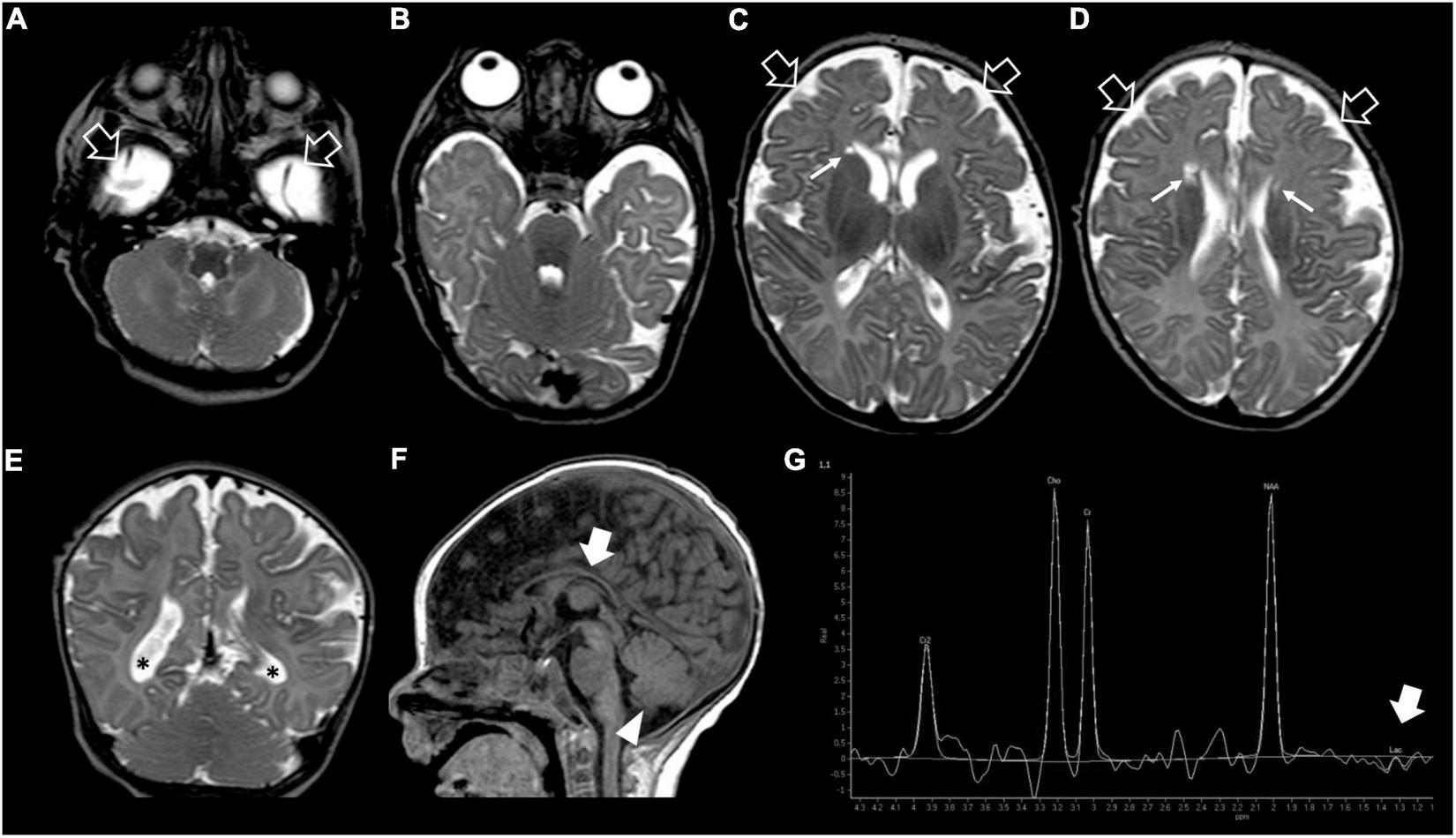 Brain MRI and MR spectroscopy at 4 months of age. (A–D) Axial and (E) Coronal T2-weighted images reveal delayed myelination, bilateral frontal periventricular cysts (arrows), enlarged subarachnoid spaces especially in the frontal-temporal regions (empty arrows), reduced white matter volume with mild lateral ventricle dilatation (asterisks). (F) Sagittal T1-weighted image shows hypoplasia of the corpus callosum (thick arrow) and inferior cerebellar vermis (arrowhead). (G) Brain MR spectroscopy performed at the level of the right basal ganglia demonstrates small lactate peaks (thick arrow).