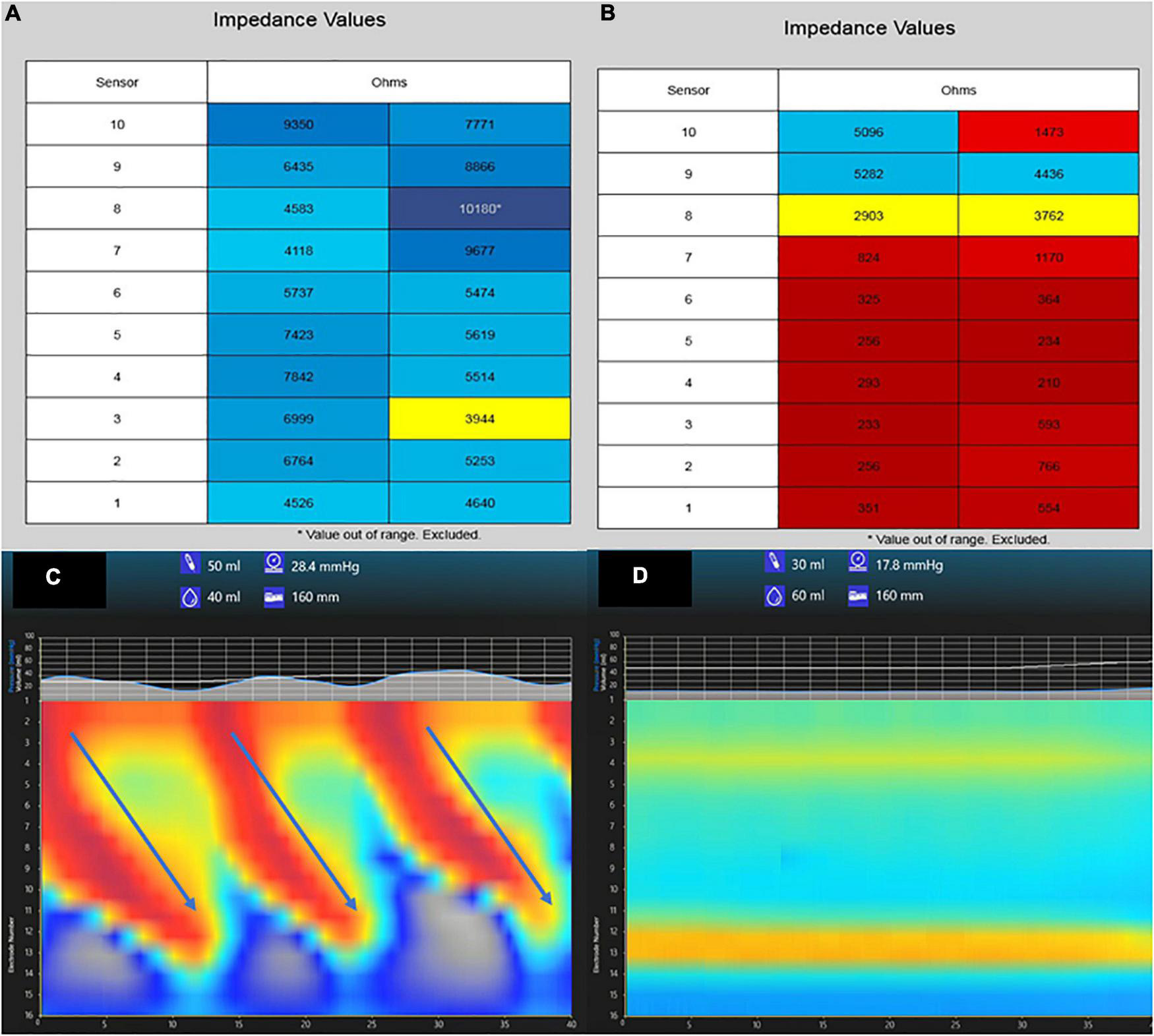 Tracings from mucosal impedance and functional luminal imaging probe (FLIP) technology. A patient with normal esophageal mucosa has high impedance values (>3,000 ohms) at multiple esophageal levels shown in blue (A), whereas a patient with pan-esophageal inflammation has low impedance values (<1,000 ohms) at multiple levels shown in red (B). A FLIP tracing from a patient with normal secondary peristalsis and esophagogastric junction relaxation (C) shows repetitive antegrade contractions (RACs, arrows) whereas a patient with absent contractions show no RACs and absent EGJ relaxation (D).