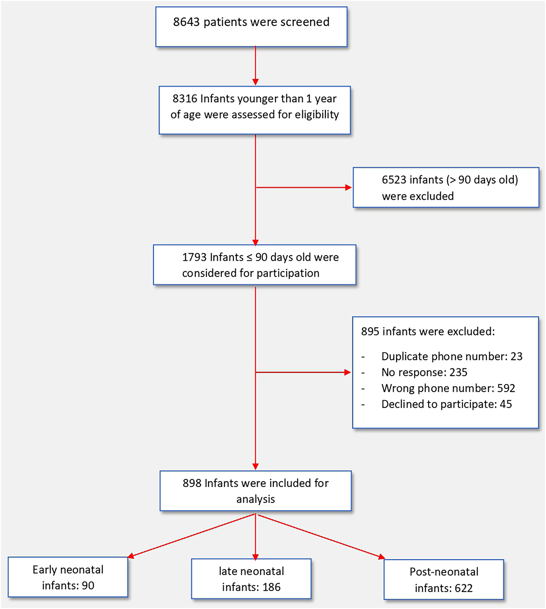 On the initial scan of the HESN database, a total of 1,793 infants of ≤ 90 days of age were identified, of them, 895 infants were excluded due to duplicate records, incorrect contact details, no response or refusal to participate. Thus, we included 898 infants in this study (Figure 1). The baseline characteristics of all three groups of infants are presented in Table 1. Included were 90 patients in the early neonatal group, 186 patients in the late neonatal group and 622 patients in the post neonatal group. Early neonatal group patients were mostly tested due to maternal positivity, whereas late neonatal and post-neonatal patients were tested either because of symptoms or being in contact with a person with positive RT-PCR test. Fever and respiratory signs were the most common presenting features in late neonatal and post-neonatal groups; however, nearly one third of them presented with irritability or gastrointestinal signs.