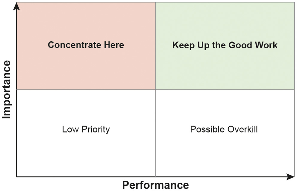 After initial analysis, we displayed the emerged themes according to Park's et al. model of the importance performance analysis (IPA, = needs assessment) (44), which aids to identify key themes of high importance with low performance, where focused improvement is needed and deemed to be fruitful (see Figure 1).