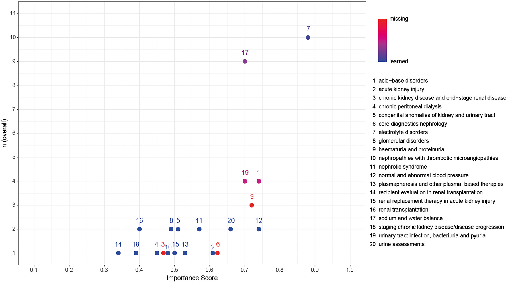 Extracted key knowledge themes from the importance performance analysis (IPA) high-importance and low-performance panel (n = 23) ranked by their importance (= number of occurrence) with nephrology themes in bold.