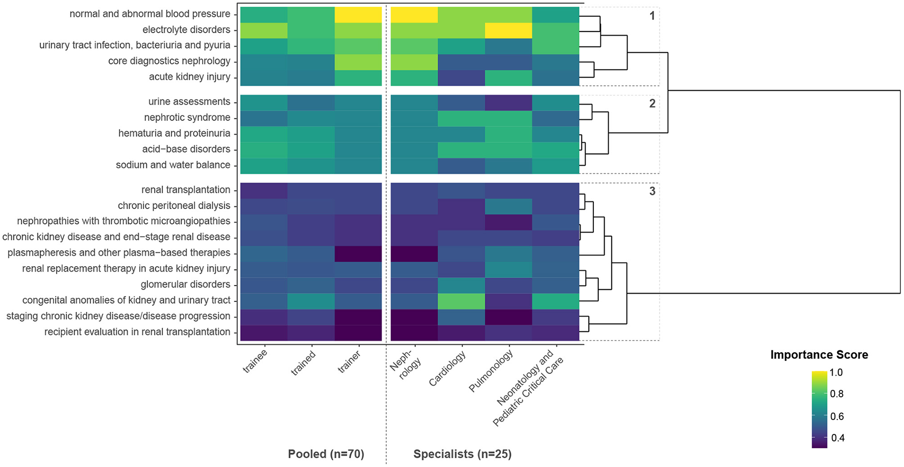 Hierarchical clustering of the most frequently mentioned themes in pediatric nephrology by importance scores (IS) of trainees, “trained,” and trainers, as well as different specialists.