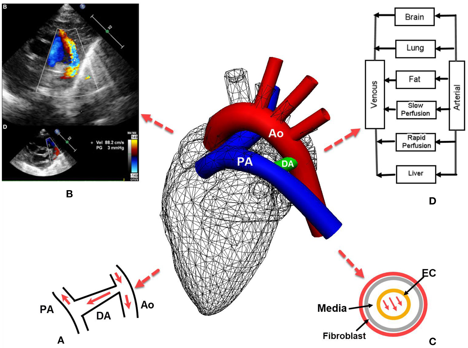 Patent ductus arteriosus (PDA) in preterm infants: (A) the left-to-right or reversed flow in PDA after birth. Note the constriction where the DA joins aorta introduces high pressure gradient according to the Bernoulli's equation; (B) echocardiography of PDA also reveals the pressure gradient between systemic and pulmonary circulations that aids hemodynamic modeling (4); (C)in silico models may be developed for the remodeling of different layers of the DA; (D) a typical pharmacokinetics model where blood flow rates are used to derive the drug amount in an organ. PA, pulmonary artery; Ao, Aorta; EC, endothelial cell.