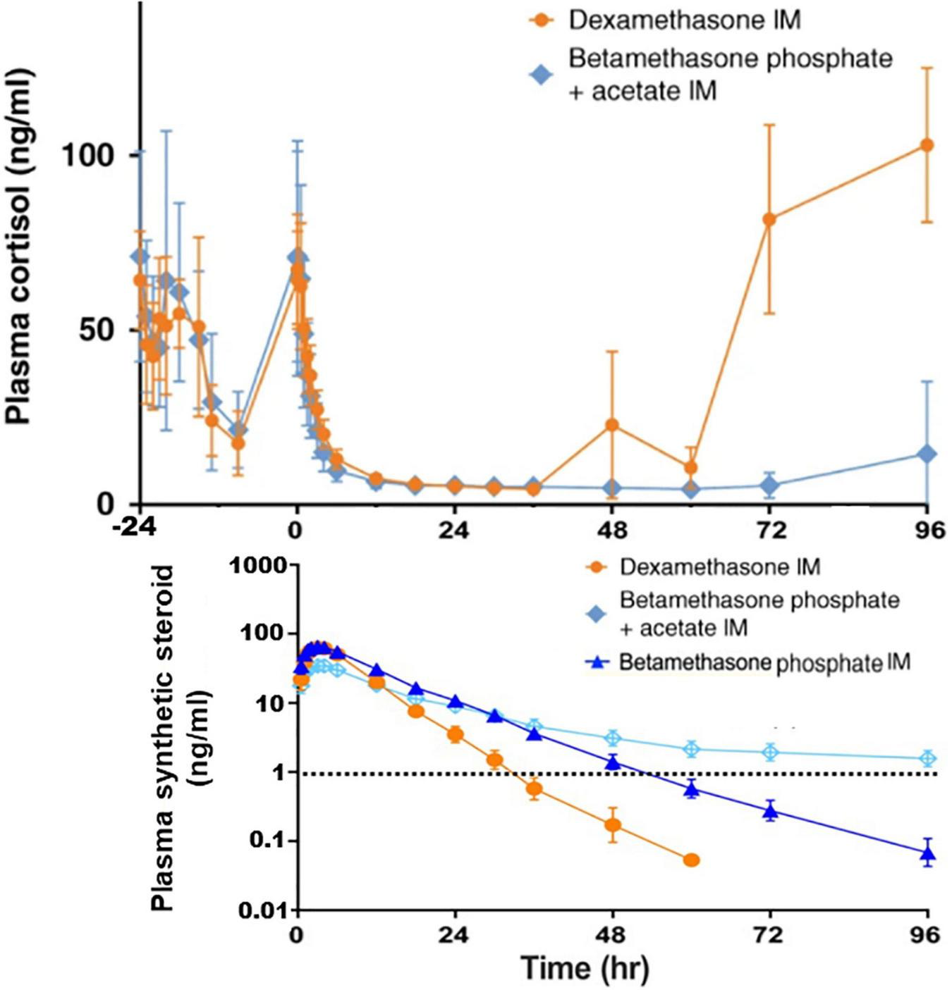 Measurements of plasma concentrations of cortisol and the synthetic steroids in non-pregnant female subjects. Cortisol concentrations are shown starting 24 h before the intramuscular (IM) injections of the following synthetic glucocorticoids: Dexamethasone phosphate (6 mg), Betamethasone acetate (3 mg) + Betamethasone phosphate (3 mg), or Betamethasone phosphate (6 mg). Betamethasone was only half of the single antenatal betamethasone dose. The limit of the synthetic steroid (∼1 ng/ml) known to suppress the endogenous cortisol synthesis is shown by dashed line. As a result of the slow release of intramuscular betamethasone acetate, its concentration in plasma exceeds 1 mg/ml even 4 days after the injection. This is likely to take place in pregnant mothers and since the synthetic steroid passes to the fetal blood, suppression of cortisol synthesis of the fetus and the newborn infant shortly after the birth is anticipated. The data shown is from the study by Jobe et al. (59, 141). Copyright from Springer Nature, and from Wiley Periodicals, Inc.