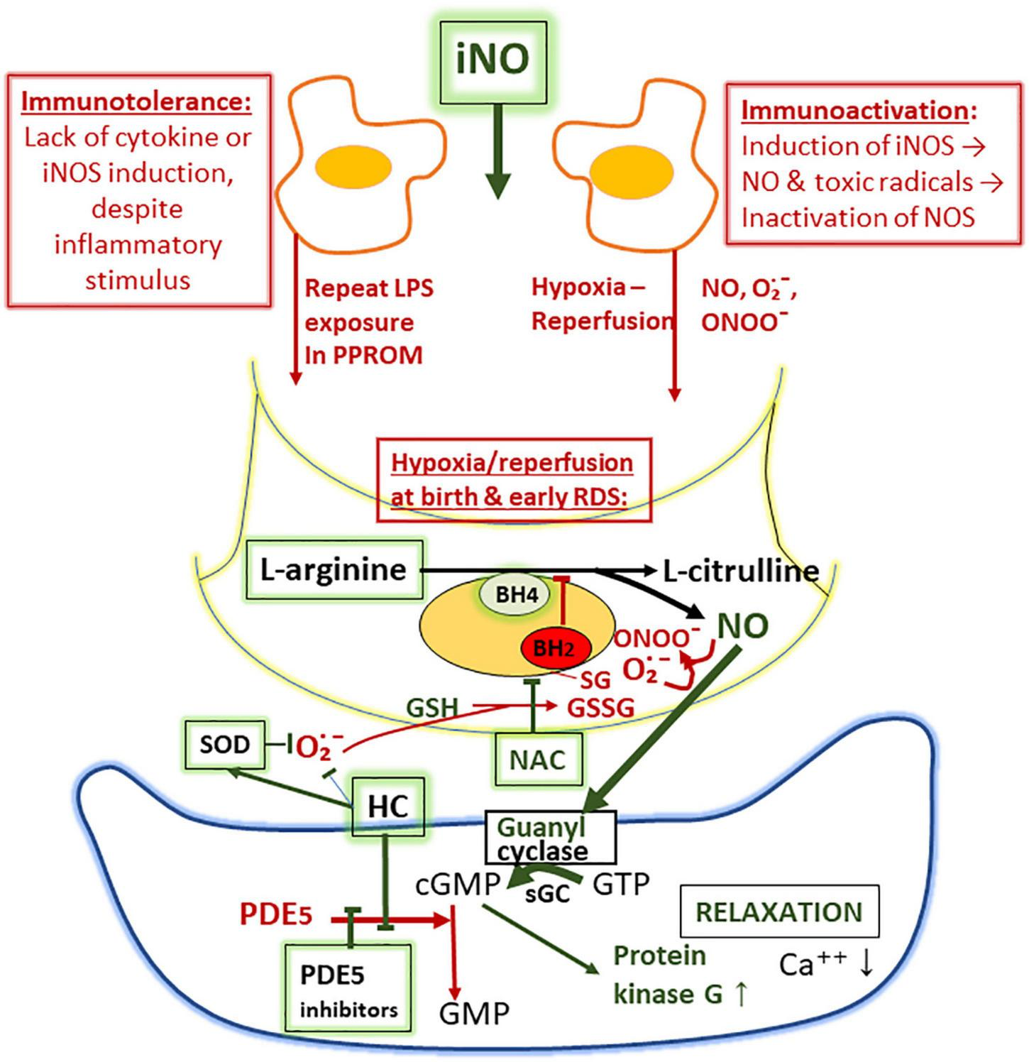Proposed mechanisms of suppression of nitric oxide (NO) synthesis in the lung as a sketch depicting macrophage (above), endothelial cell (middle), and smooth muscle cell (below). The lack of NO synthesis is proposed to be due to (i) failure of iNOS synthesis due to immunotolerance, associated with inflammatory insults by prolonged rupture of fetal membranes and (ii) oxidant-induced inactivation of endothelial NO synthase (eNOS) involving glutathionylation, resulting in diversion of the NO synthetase (NOS)-catalyzed NO production to superoxide (O2∙−) production (uncoupling). Superoxide converts NO to toxic peroxynitrite (ONOO–). Tetrahydrobiopterin (BH4), an essential co-factor of eNOS, may also be oxidized to BH2 upon inactivation of eNOS during ischemia-reperfusion injury. Phosphodiesterase-5 (PDE5) inhibitors (sildenafil), hydrocortisone (HC; inhibits PDE5 synthesis and the formation of superoxide), superoxide dismutase (SOD; breaks down superoxide), and N-acetylcysteine (NAC; source of cysteine and reduced glutathione) and L-arginine (substrate of NOS) are augmenting the formation and the activity of NO.