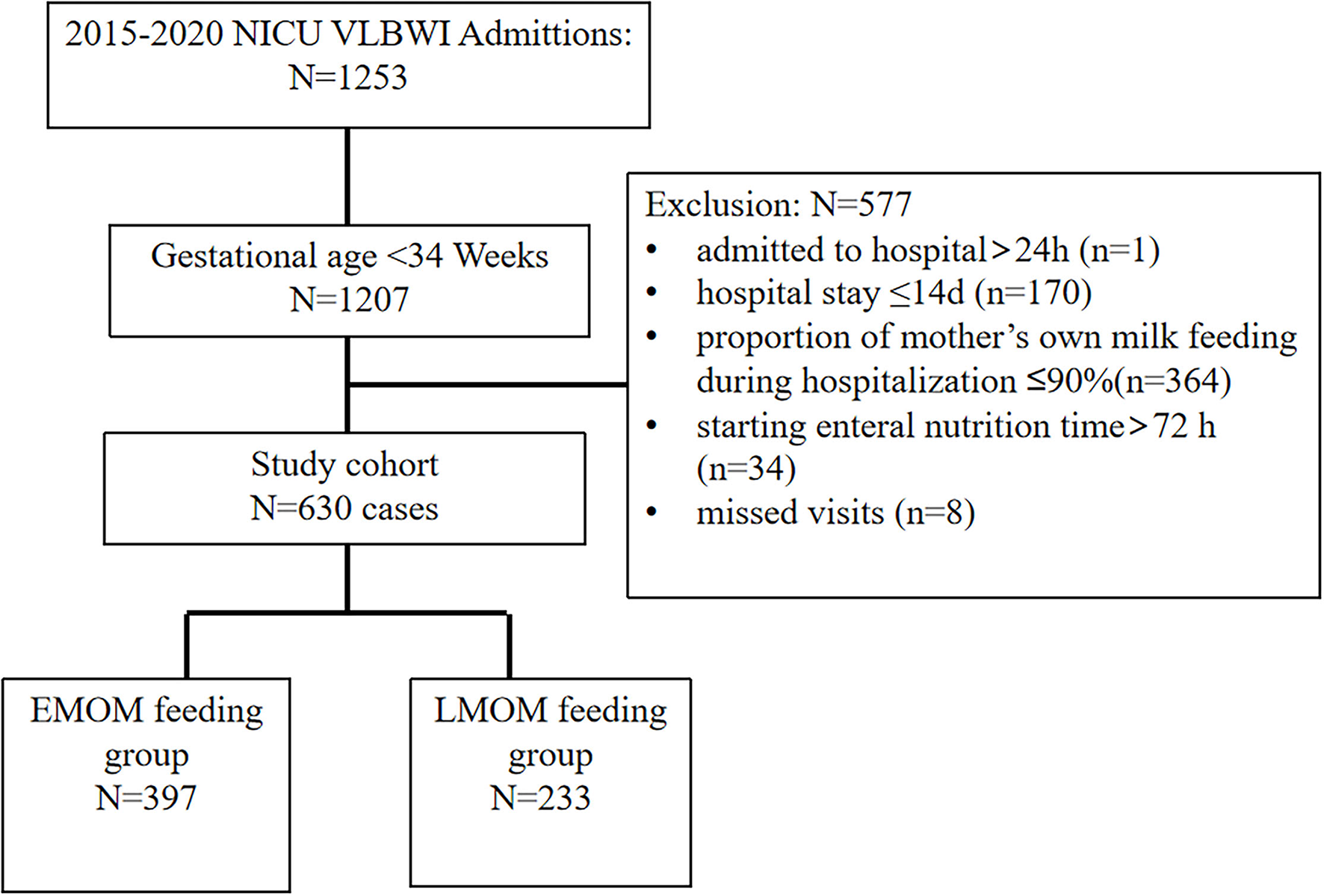 Infants with VLBW were divided into the EMOM feeding group and the LMOM feeding group, according to the classification criteria.