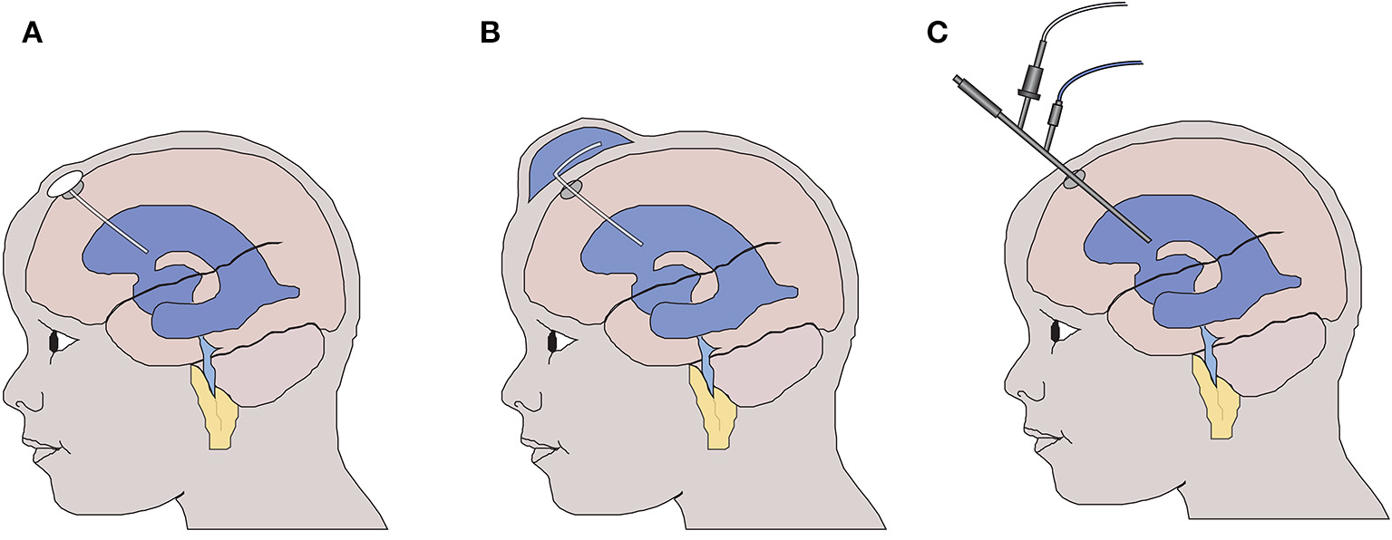 Temporizing interventions used for the treatment of neonatal post haemorrhagic hydrocephalus. (A) Ventricular access device – a CSF reservoir is inserted allowing intermittent aspiration of CSF to control intraventricular pressure. (B) Ventricular subgaleal shunt – the potential space between the galea and the periosteal lining of the cranium is surgically opened allowing CSF to drain into the subgaleal space. (C) Neuroendoscopic lavage of the ventricular system with or without septostomy to access the contralateral ventricle. The blood-stained CSF is removed to reduce the potential toxicity to the wall of the lateral ventricle.