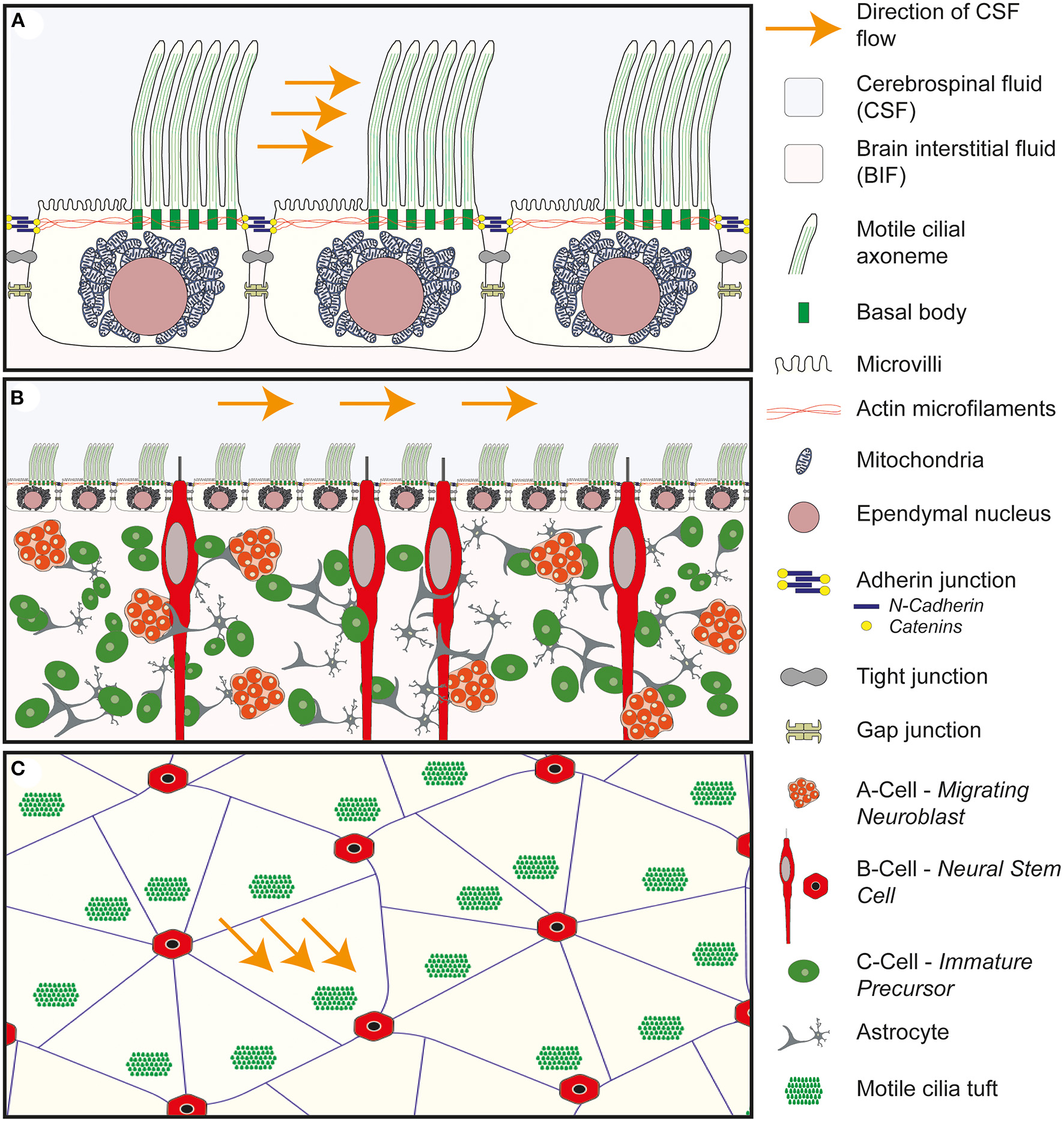 Anatomy of the wall of the lateral ventricle. (A) Anatomy of the E1 ependymal cilia. Multiple motile cilia are shown arising from basal bodies within the apical/ventricular surface of the cell. The basal bodies are shown to be tightly integrated with the actin microfilaments which maintain the structure of the ependymal cell. The motile cilia are asymmetrically distributed across the surface of the cell and found in a tuft of cilia in a downstream position in relation to the flow of CSF. The remainder of the surface is covered in microvilli. Deep to the apical surface the large spherical shaped nucleus is seen surrounded by mitochondria. Connecting the ependymal cells together are three cell to cell junctions: the adherin junction, consisting of n-cadherin and catenins, tight junctions and gap junctions. (B) Cross-sectional anatomy of the wall of the lateral ventricle demonstrating the relationship between the ependymal layer and the underlying neural stem progenitor cells within the subventricular zone. The ependymal layer sits at the interface of the cerebrospinal fluid (CSF) and the brain interstitial fluid (BIF) and acts as a gatekeeper, modulating the brain microenvironment surrounding the NSPC. (C) Enface anatomy of the wall of the lateral ventricle. The tuft of motile cilia are seen to arise from a downstream position in relation to the flow of CSF. The E1 ependymal cells are arranged in a pin-wheel orientation around the cilia of the b-cell.