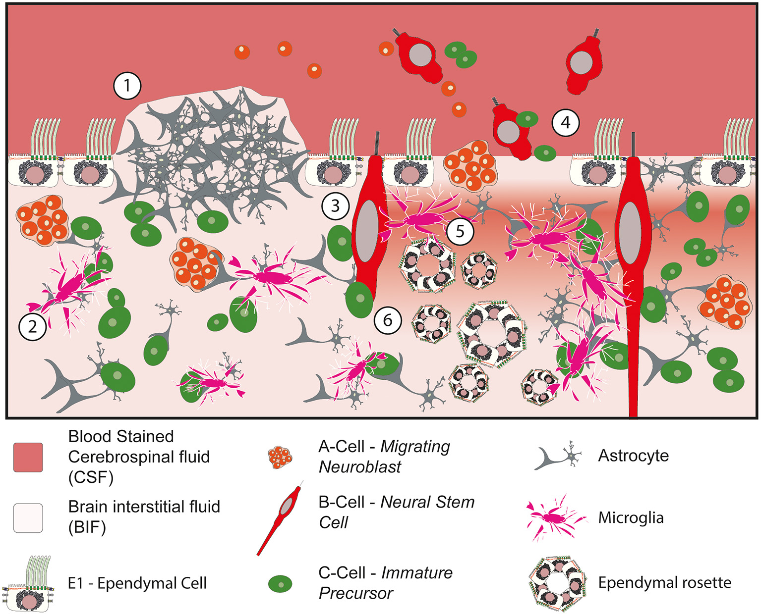 Impact of denudation of the ependyma within the ventricular and subventricular zones. (1) Subventricular glial nodule bulging into the ventricular lumen. The ependymal surface is discontinuous over the surface of the nodule but islands of ependymal cells remain intact in the surrounding vicinity. (2) Migration and activation of microglia into the subventricular zone. (3) Damage to the neural stem progenitor cells with exposure to bloodstained CSF. (4) Loss of ependymal cells within the lining of the ventricle causes cells to escape into the CSF. (5) Loss of homeostasis at the CSF to BIF border causes periventricular egress of CSF, seen as a band of oedema/hypodensity in the subventricular zone. (6) Ependymal rosettes are seen deep to areas of ependymal denudation within the subventricular zone.