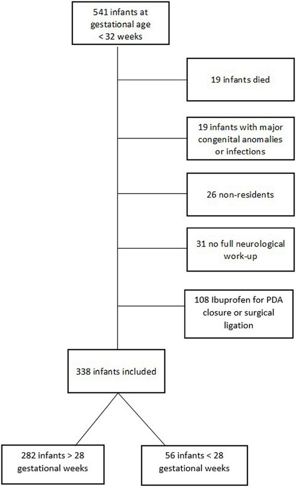 This study was conducted as a retrospective analysis of prospectively collected data. Infants born at less than 32 weeks of gestation between February 2011 and December 2018 at Innsbruck Medical University were enrolled. The detailed inclusion and exclusion criteria are shown in Figure 1. Maternal and neonatal data were collected during the hospital stay and described in our previous work (13). Detailed information concerning echocardiographic assessment and PDA treatment has been published in detail in our recent paper.