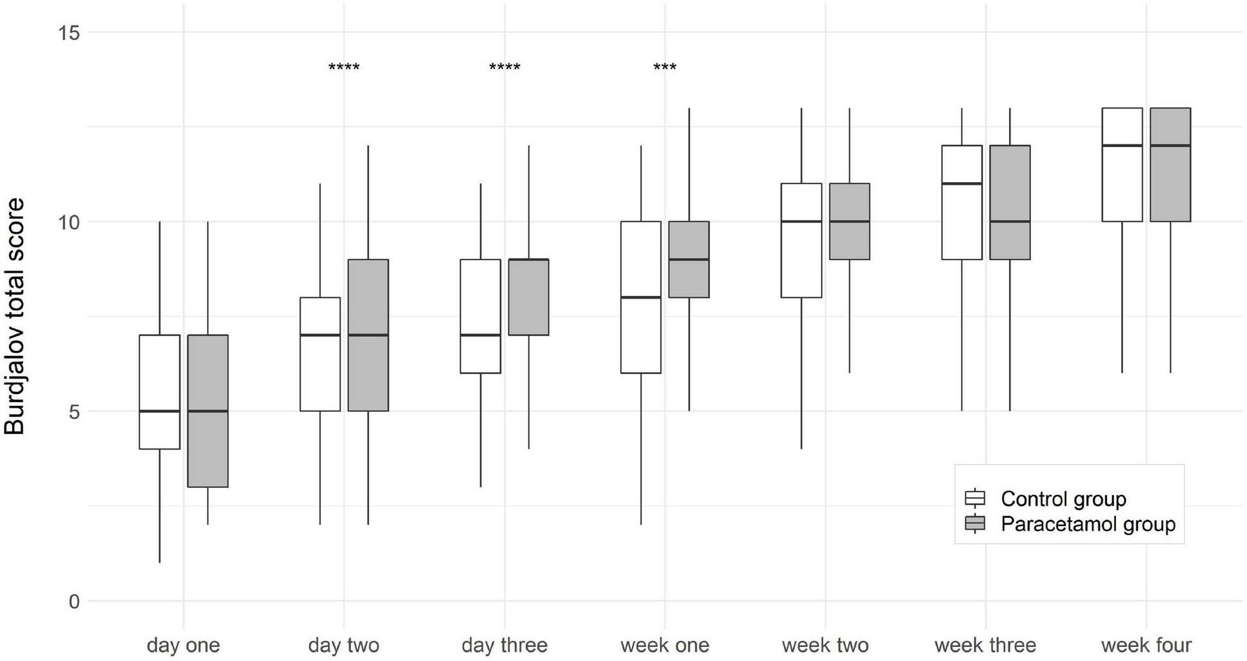 Boxplots of Burdjalov total score (median, interquartile range) at each time point in the paracetamol and control group. Significant results of the logistic regression are marked with asterisks. ***p < 0.001, ****p < 0.0001.