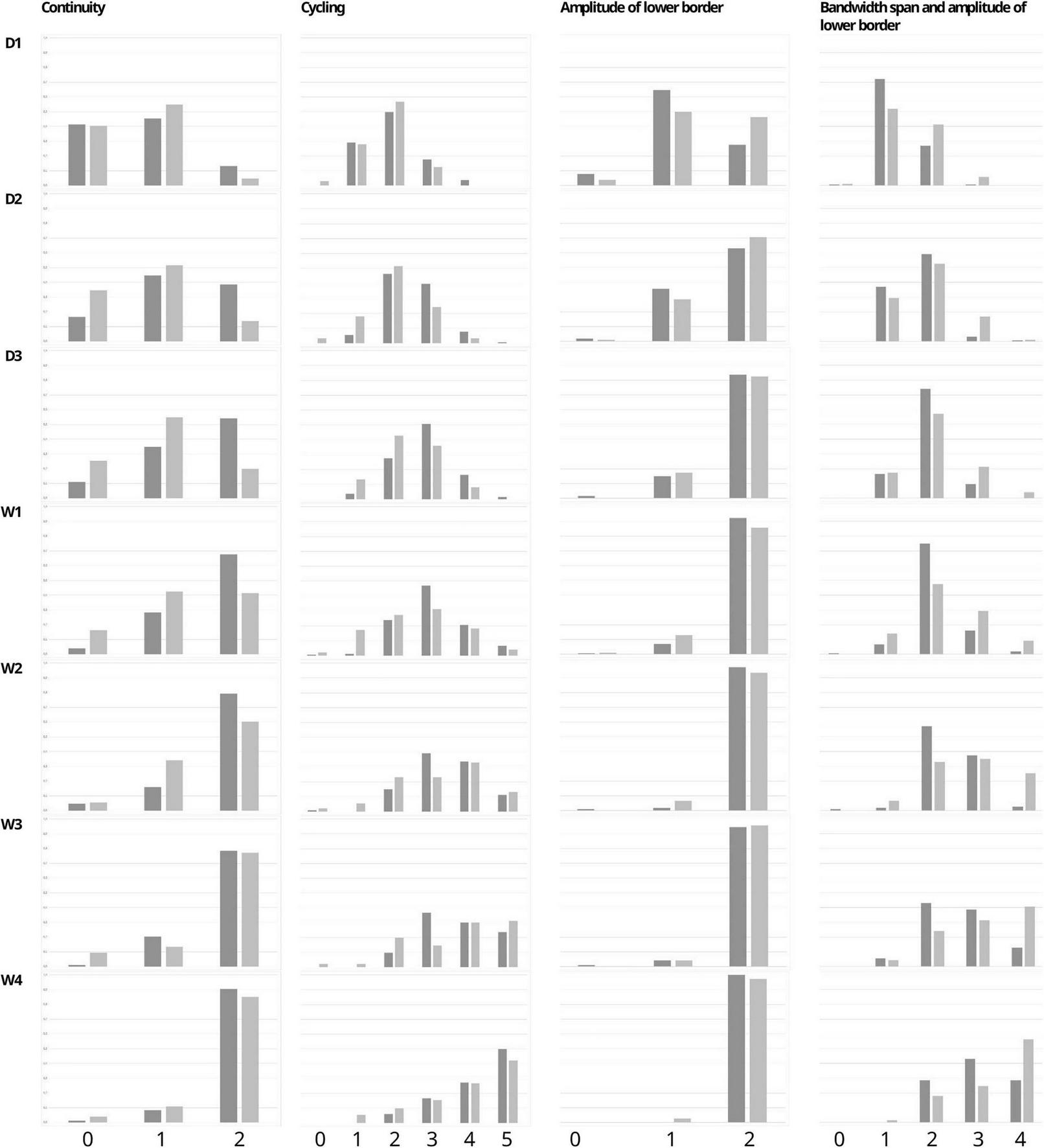 Percentage of infants with each Burdjalov single score (Continuity, Cycling, Amplitude of the lower border, and the Bandwidth span and amplitude of lower border) at each time point in the paracetamol and control group.