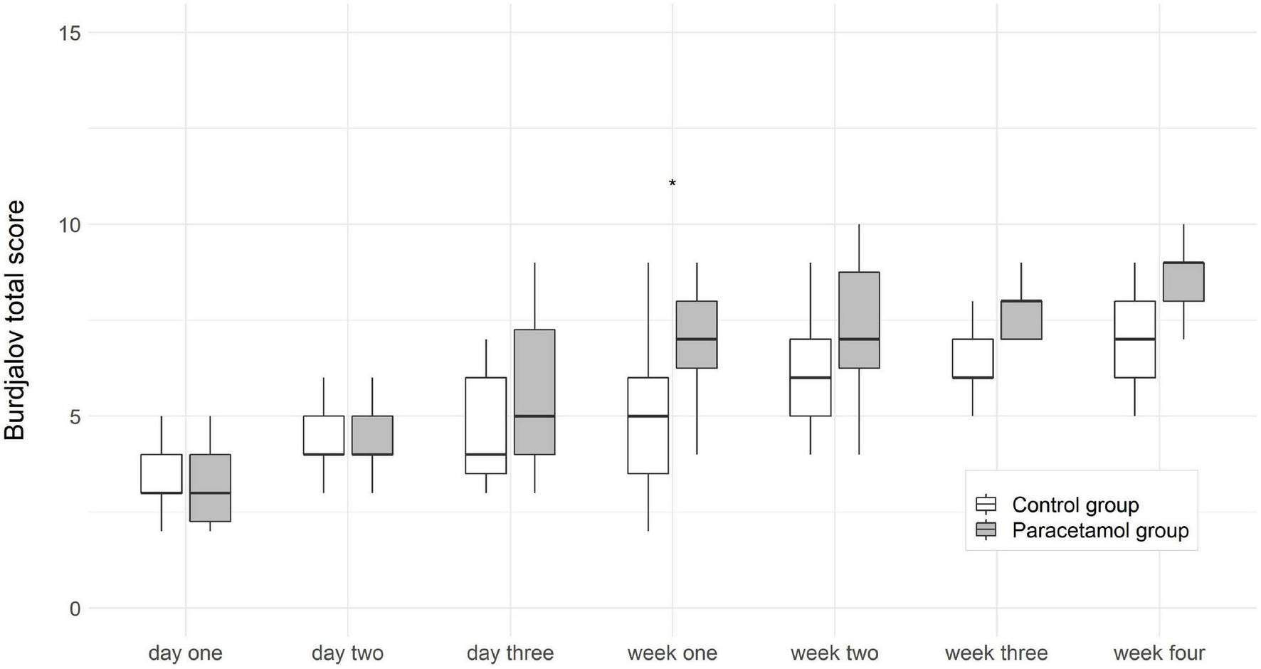 Boxplots of Burdjalov total scores (median, interquartile range) at each time point in the paracetamol and control group for infants born <28 gestational weeks. Significant result of the logistic regression is marked with asterisk. *p < 0.05.