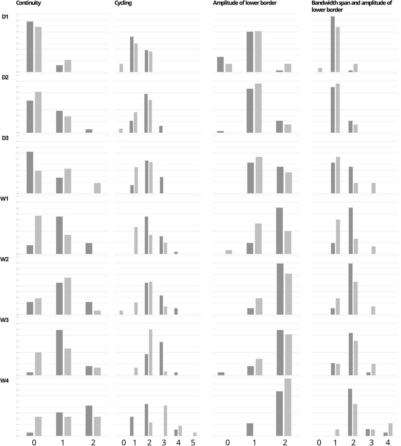 Background scoring, according to the method described by Burdjalov et al., including four single parameters: continuity (0–2 points), cycling (0–5 points), amplitude of the lower border (0–2 points), bandwidth span combined with the amplitude of the lower border (0–4 points). The sum equals the total score (maximum of 13 points) (16).