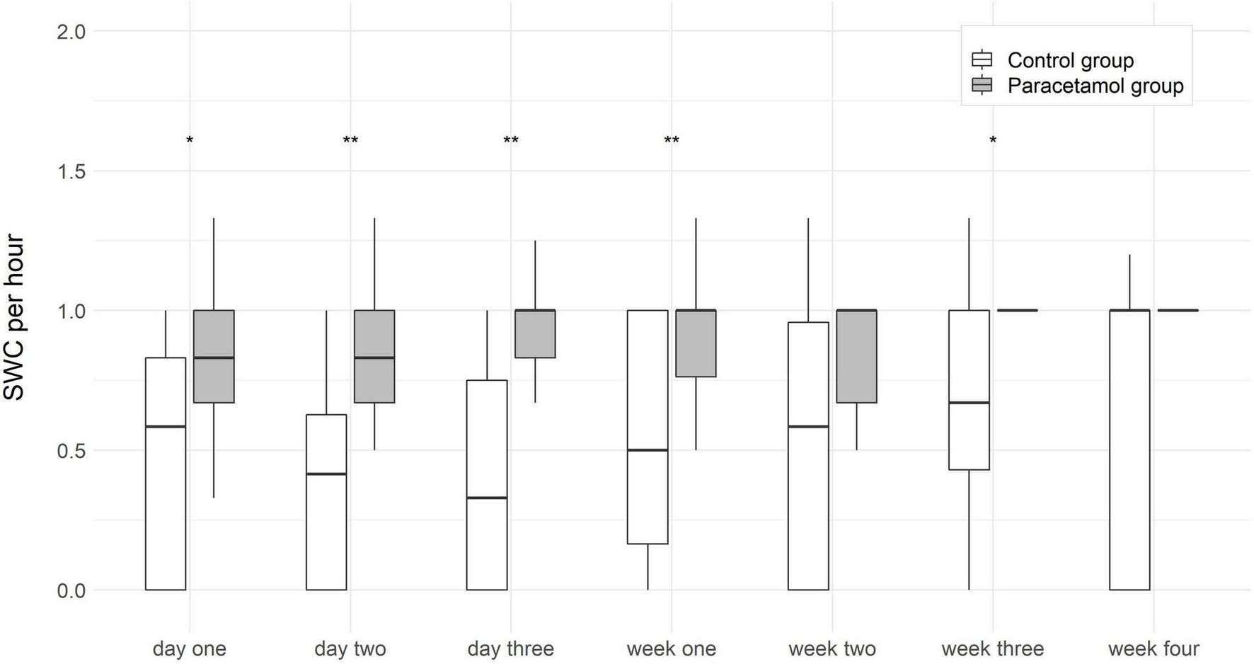 Boxplots of sleep-wake cycles (SWC) per hour at each time point in the paracetamol and control group. Significant results of the logistic regression are marked with asterisk. **p < 0.01, ***p < 0.001.