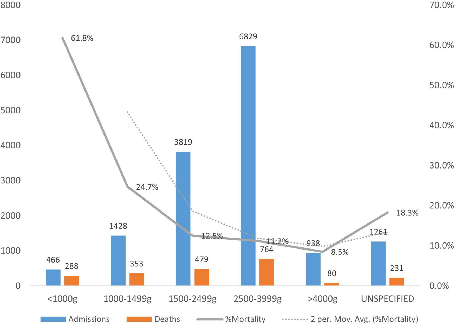 Appraising neonatal mortality causes in Nigeria, or probably in many developing countries, has been somewhat challenging. Large-scale studies were done using verbal autopsy techniques at community levels. The country’s demographic health survey indicated a slow decline in the neonatal mortality rate from 42 in 1990 to 39 per 1,000 live births in 2018 (4, 13). The studies mentioned above have many limitations with the current data gathering methods. This may explain, for instance, the complete absence of neonatal jaundice and thermoregulatory problems as a cause of mortality in the newborn (13). Furthermore, the contributions of preterm babies and their specific morbidities are often not reflected. Hence a holistic picture of neonatal mortality would require an appraisal of community and hospital-based data stratified by the gestational categories. A few reports have attempted to describe the hospital-based neonatal mortality and morbidity trends. However, they have often included relatively small numbers. They tend to have significant limitations in the disease categorizations, especially among preterm babies (14–18).