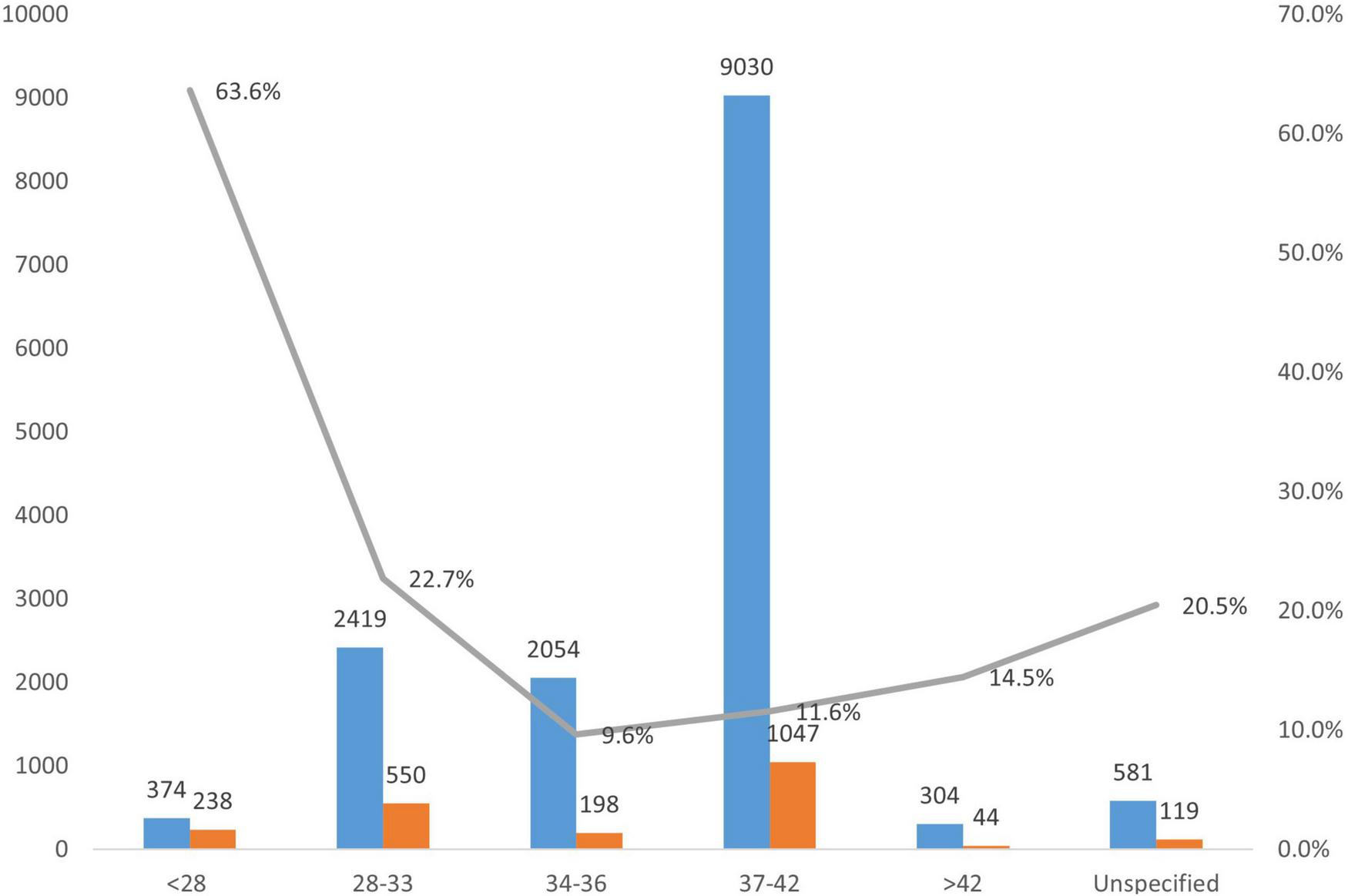 The highest percentage of mortality (63.6%) was among babies with gestational age < 28 weeks, while the least percentage of mortality (9.6%) was among those with gestational age 34–36 weeks. The other details are shown in Figure 7.